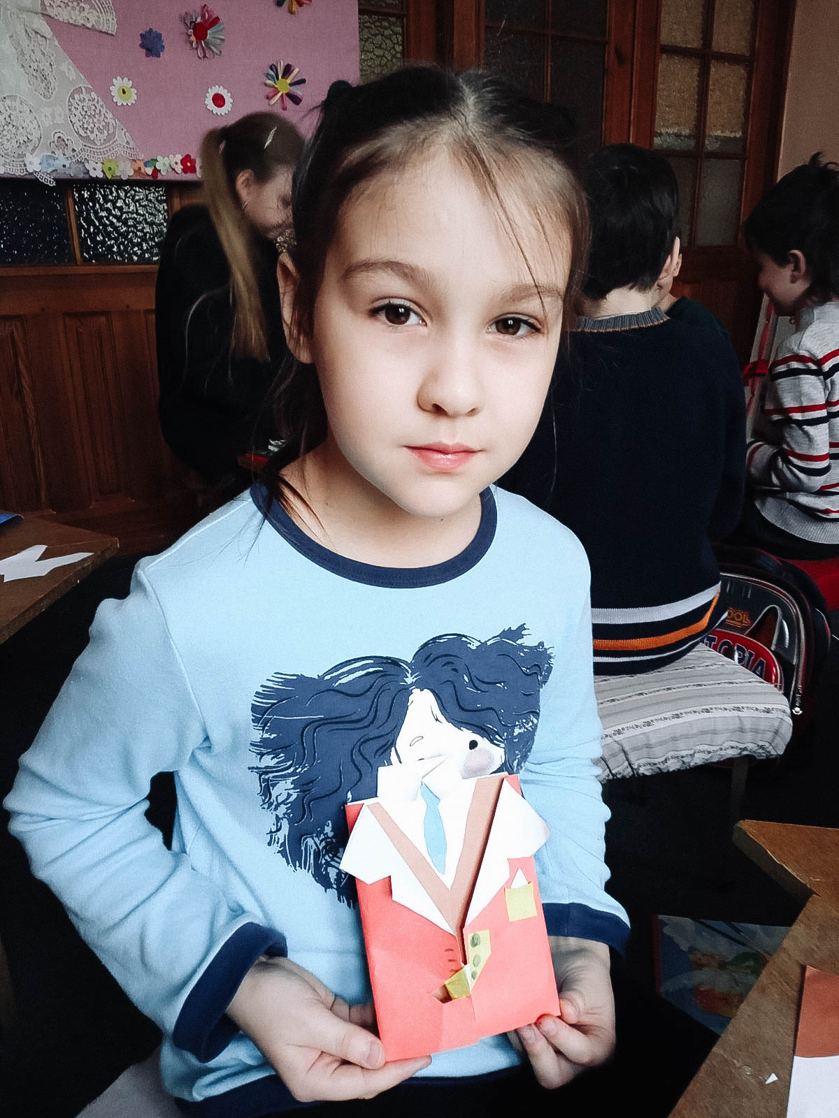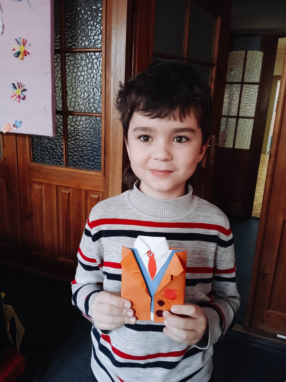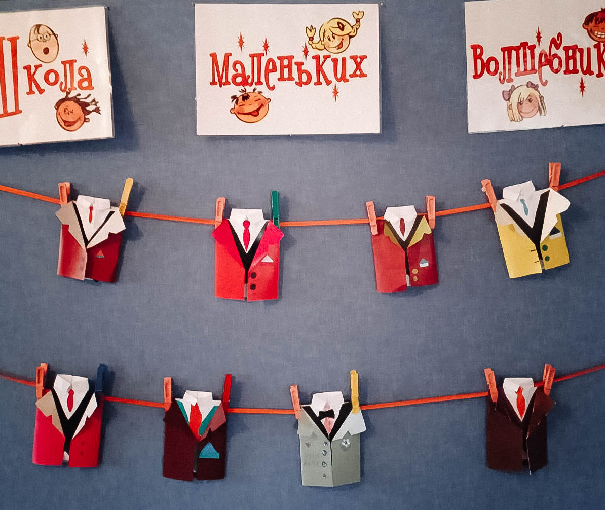 Истории увлекли маленьких волшебников. Для своих пап они сделали открытки в виде костюма из бумаги и картона с сюрпризом внутри, где оставили свои пожелания.