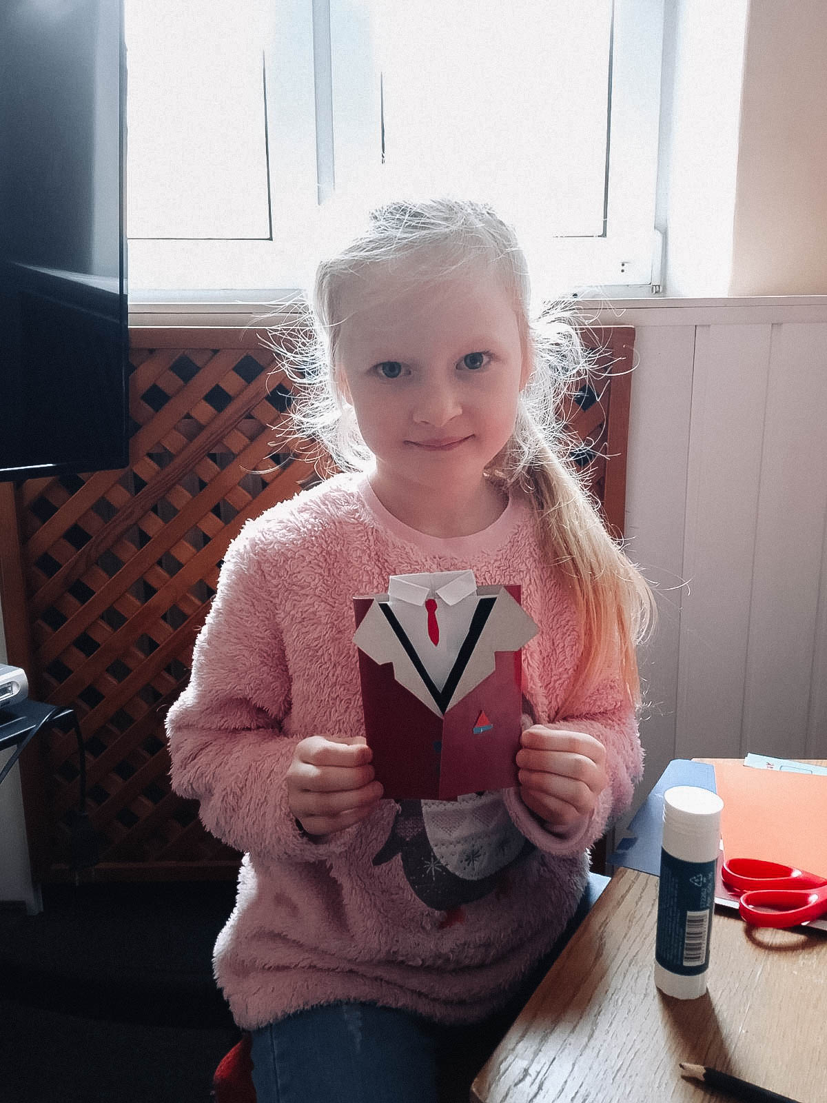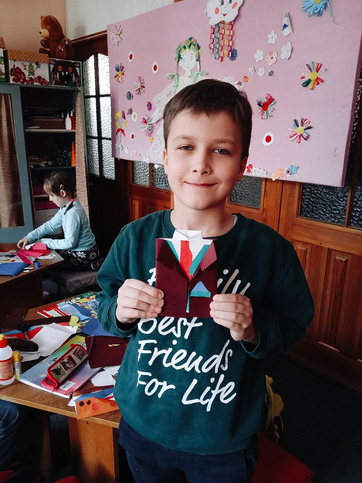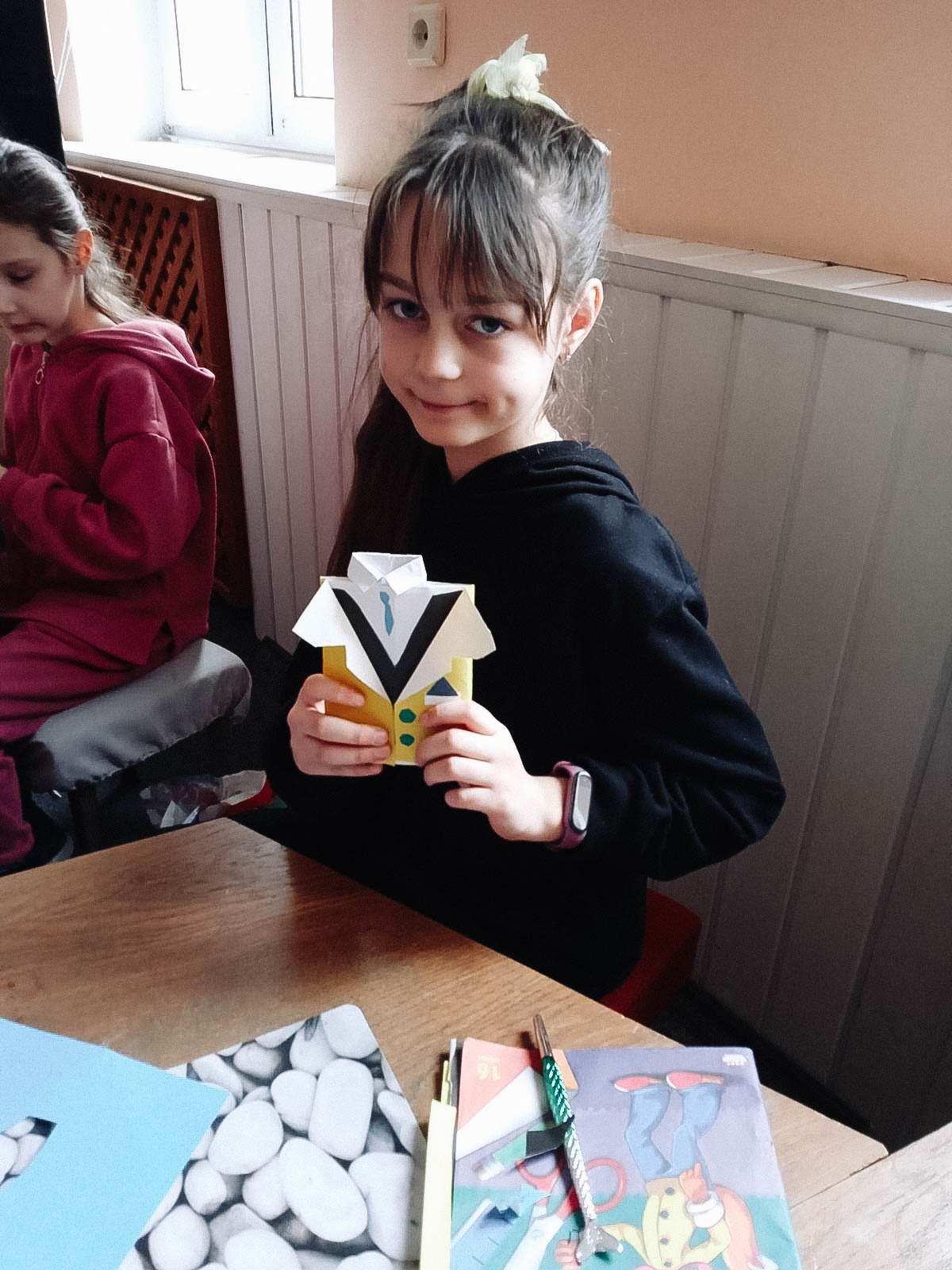Истории увлекли маленьких волшебников. Для своих пап они сделали открытки в виде костюма из бумаги и картона с сюрпризом внутри, где оставили свои пожелания.