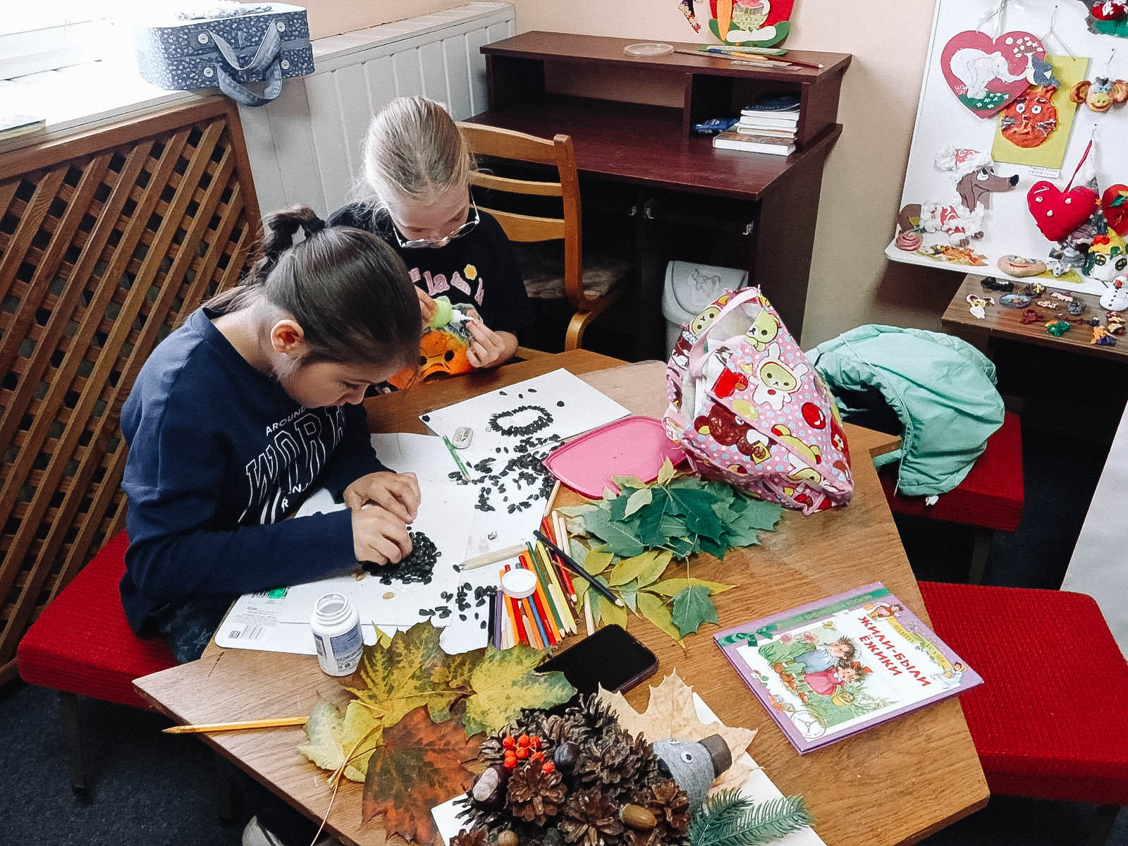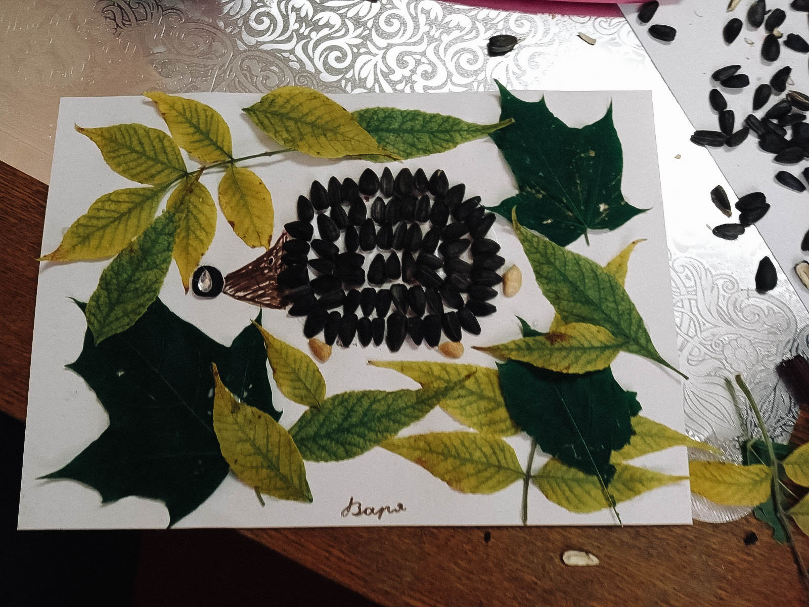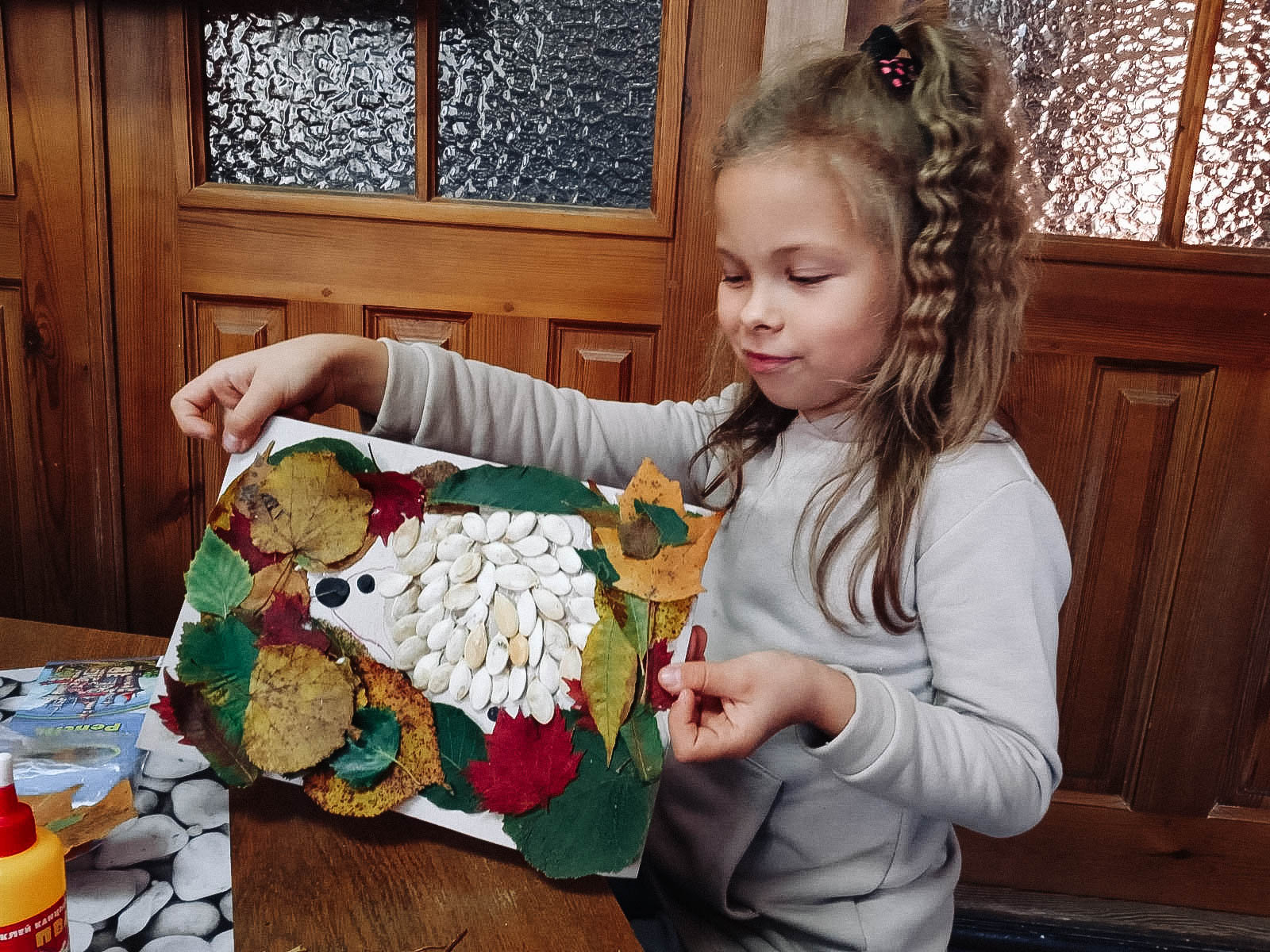 Старшая группа с удовольствием читала забавные истории А. Усачёва «Жили-были Ёжики». Герои книги — семейство ёжиков: папа, ежата Вовка и Вероника, их друзьях. Книга учит добру, дружбе, любви к ближним, к окружающей среде. Юные волшебники решили сделать аппликации ёжиков из листьев и семечек.
