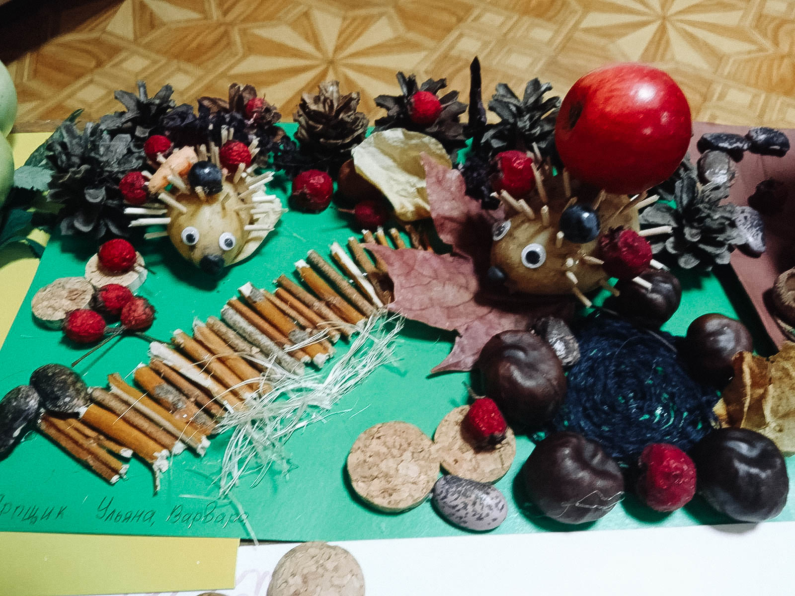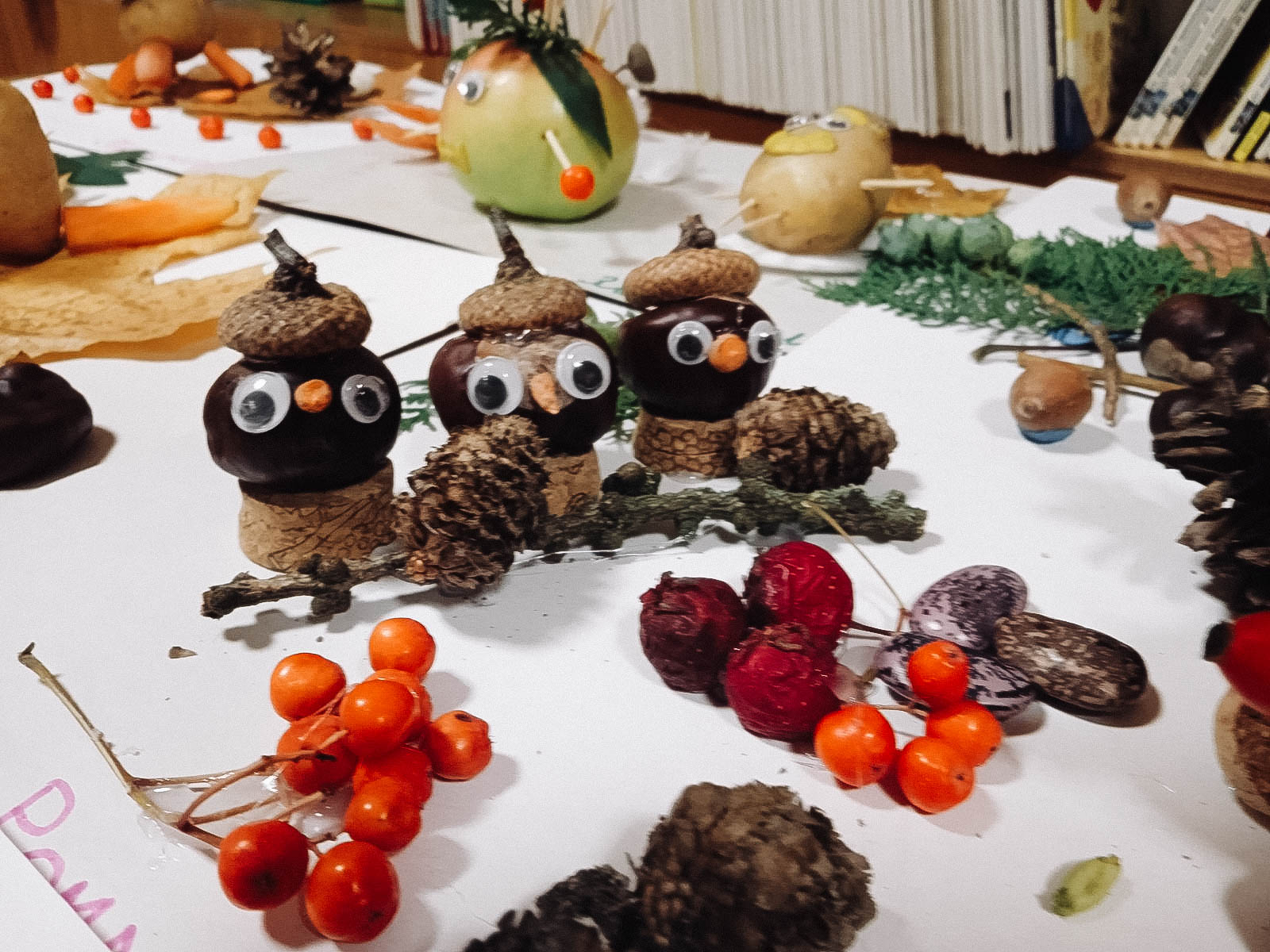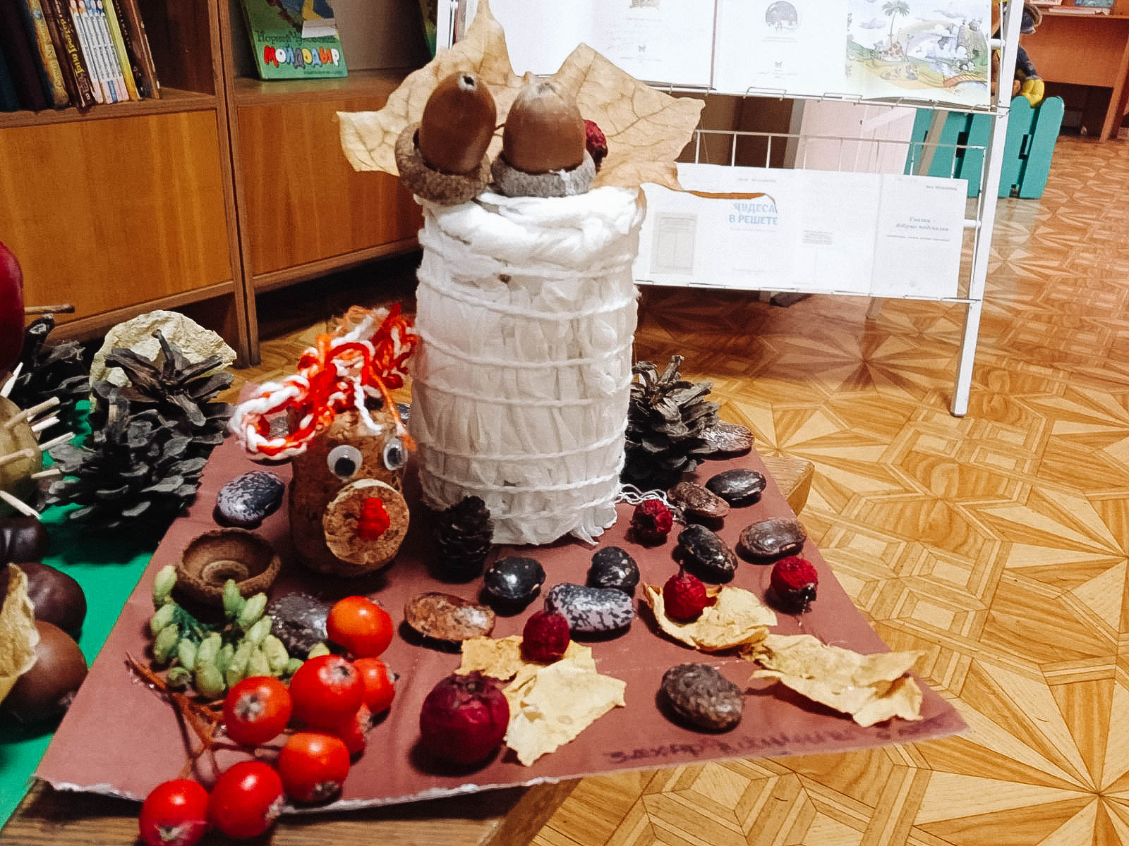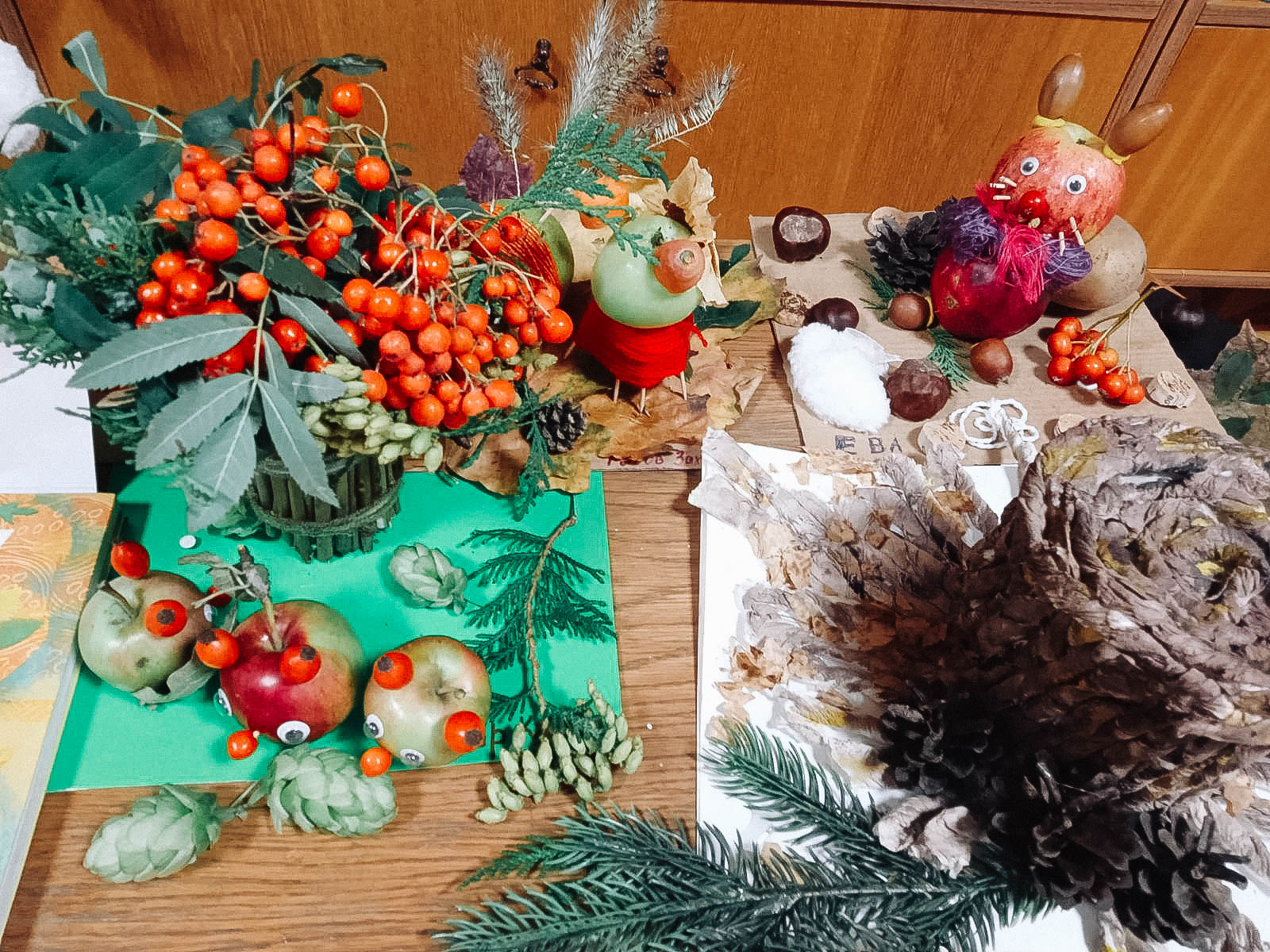 Волшебники присутствовали на занятии вместе с родителями. Прочитали «Большую книгу природы» Н. Дэвиса и сделали поделки из природных материалов: шишек, листьев, рябины, картофеля, моркови и т. д.