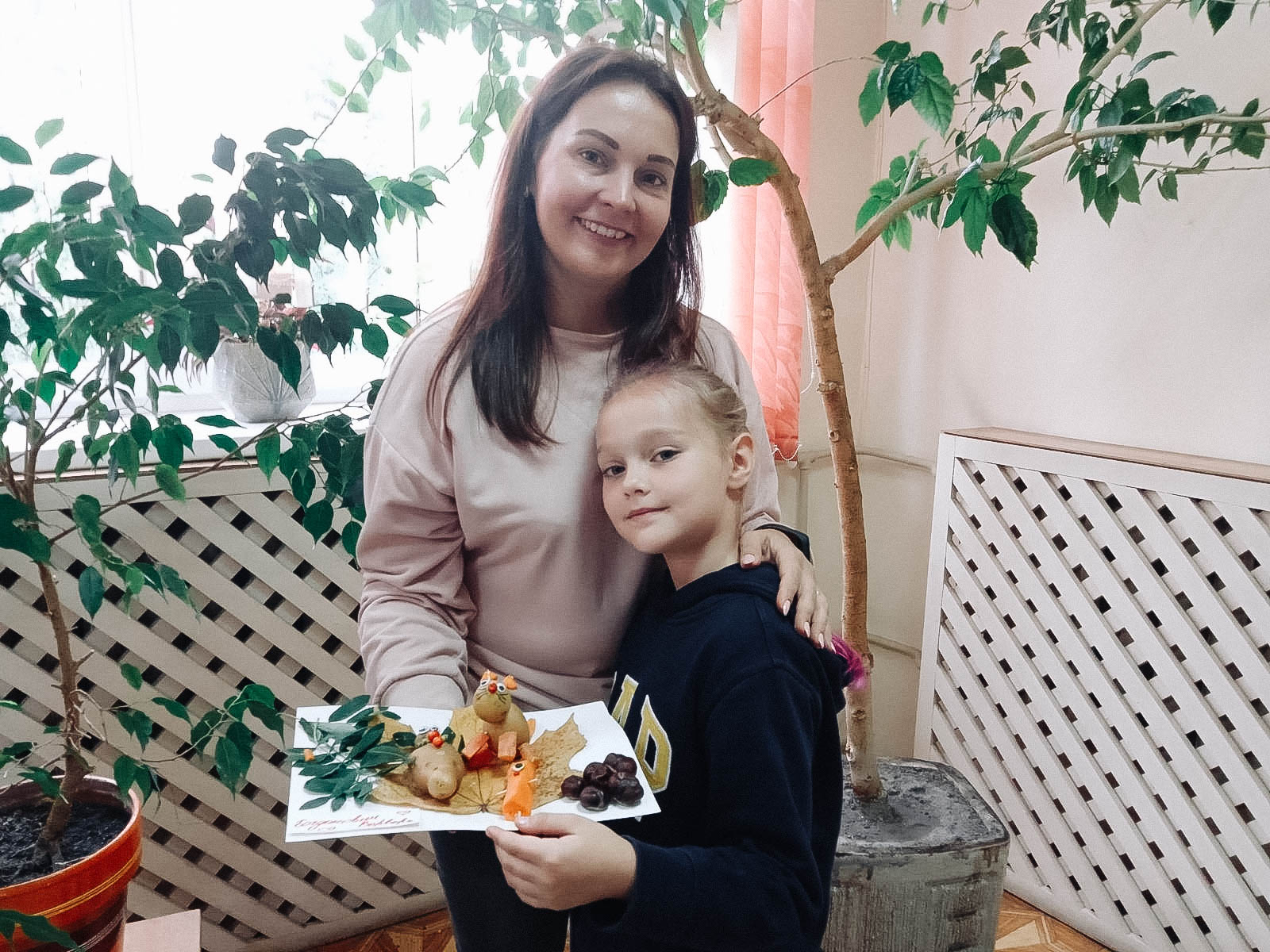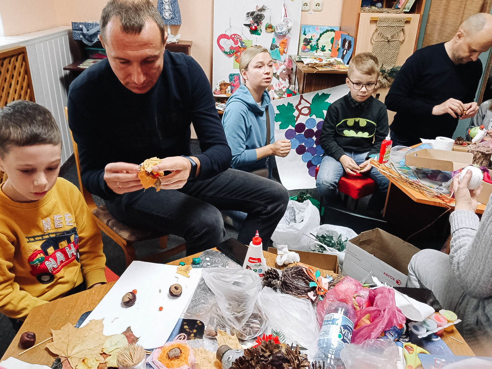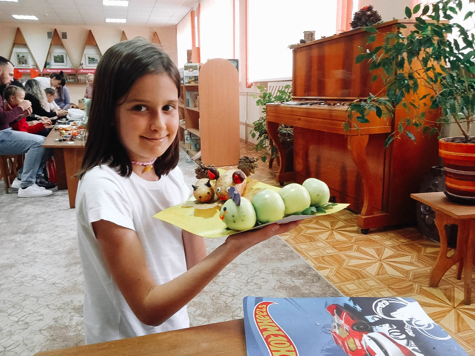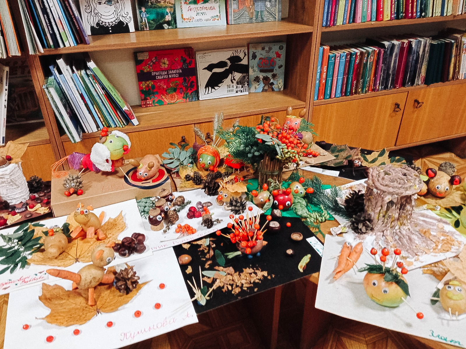 Волшебники присутствовали на занятии вместе с родителями. Прочитали «Большую книгу природы» Н. Дэвиса и сделали поделки из природных материалов: шишек, листьев, рябины, картофеля, моркови и т. д.