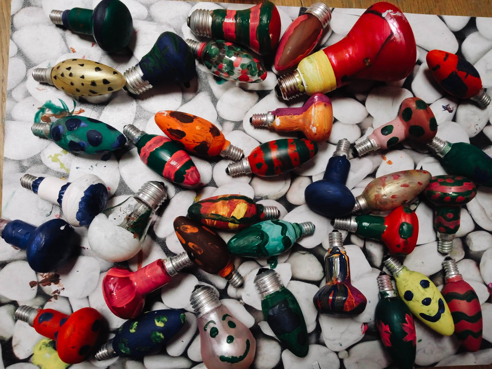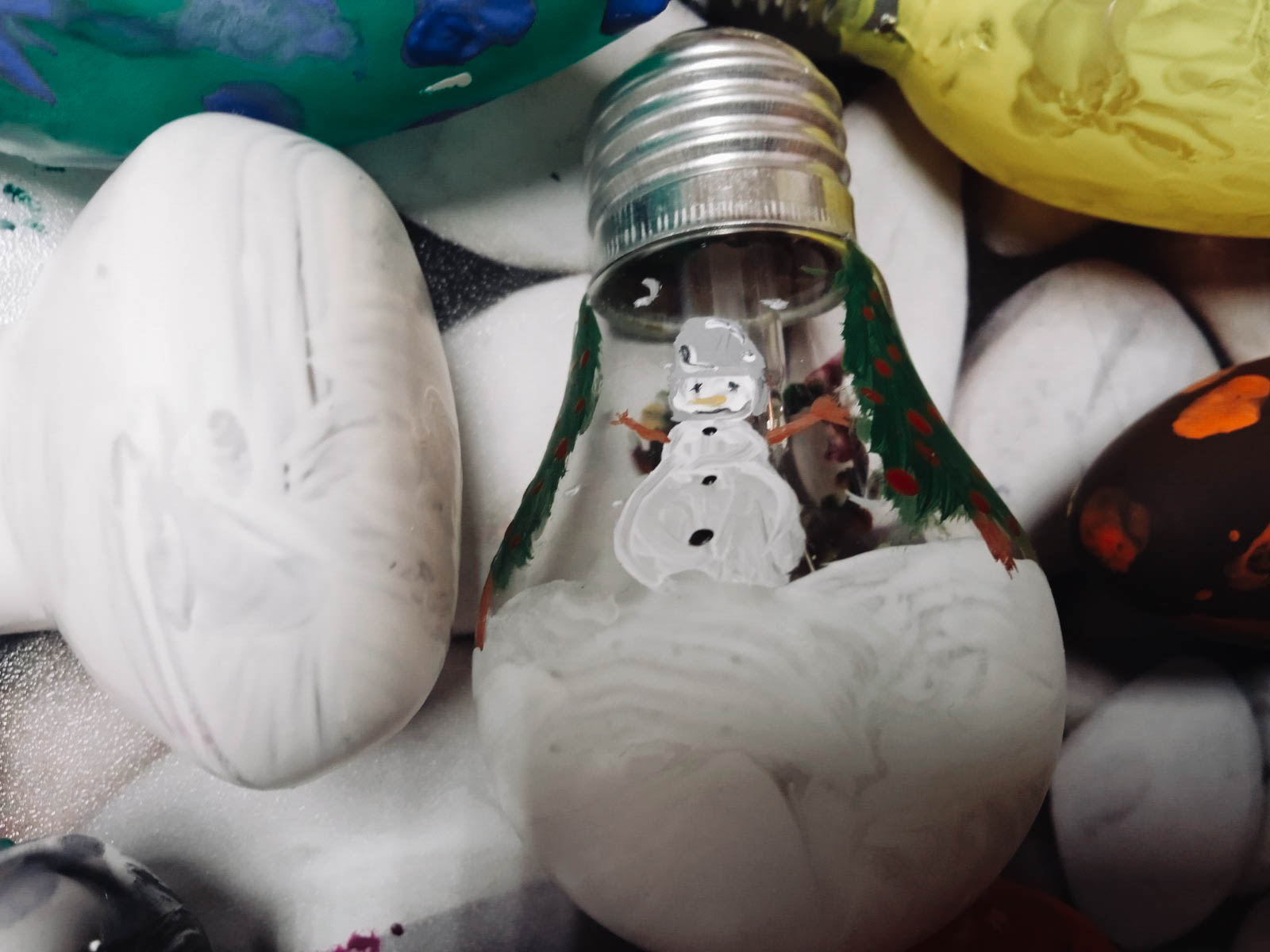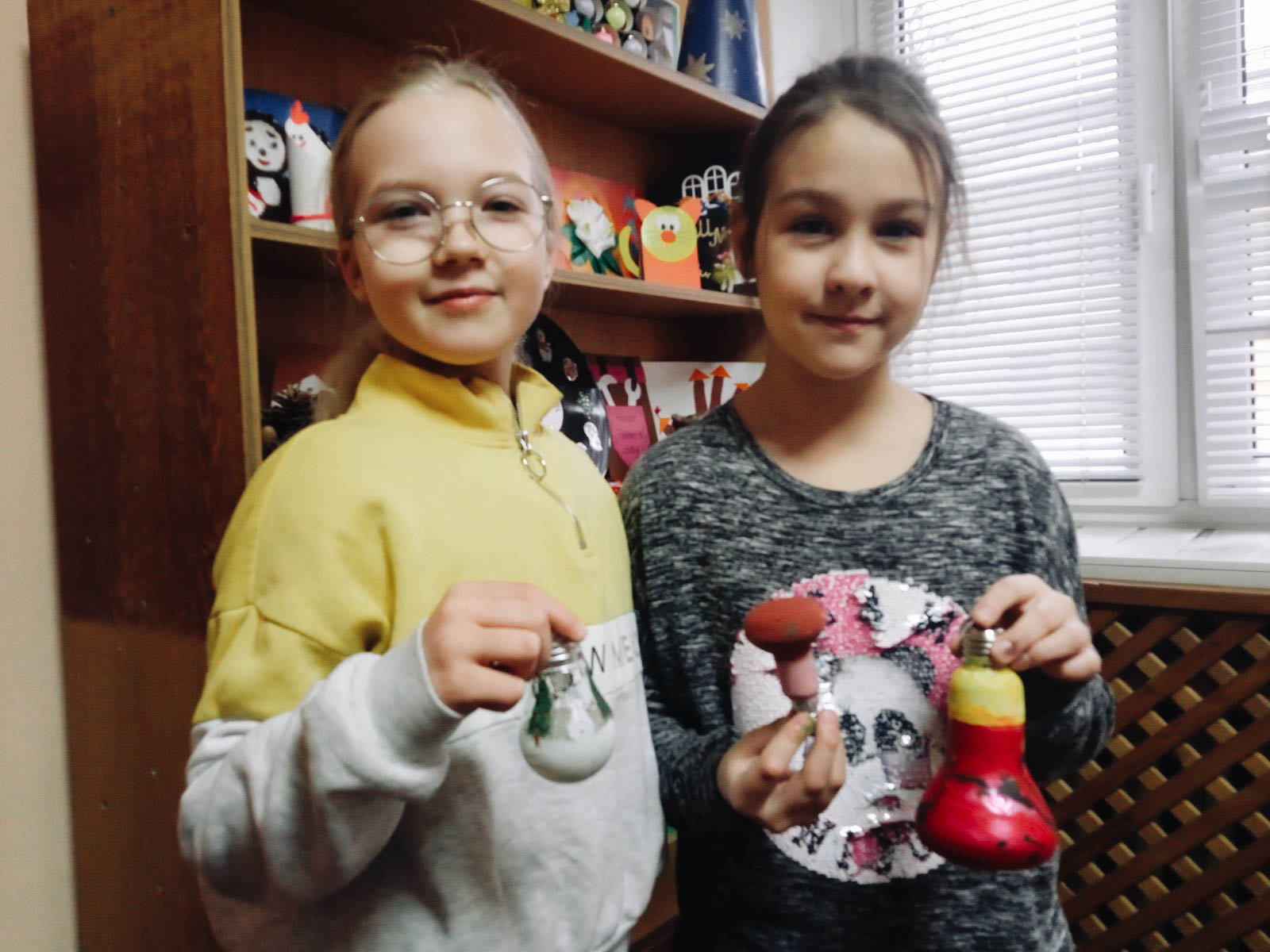 Дети вместе с Дедом Морозом решили украсить лампочками ёлку и сделали из них новогодние игрушки.