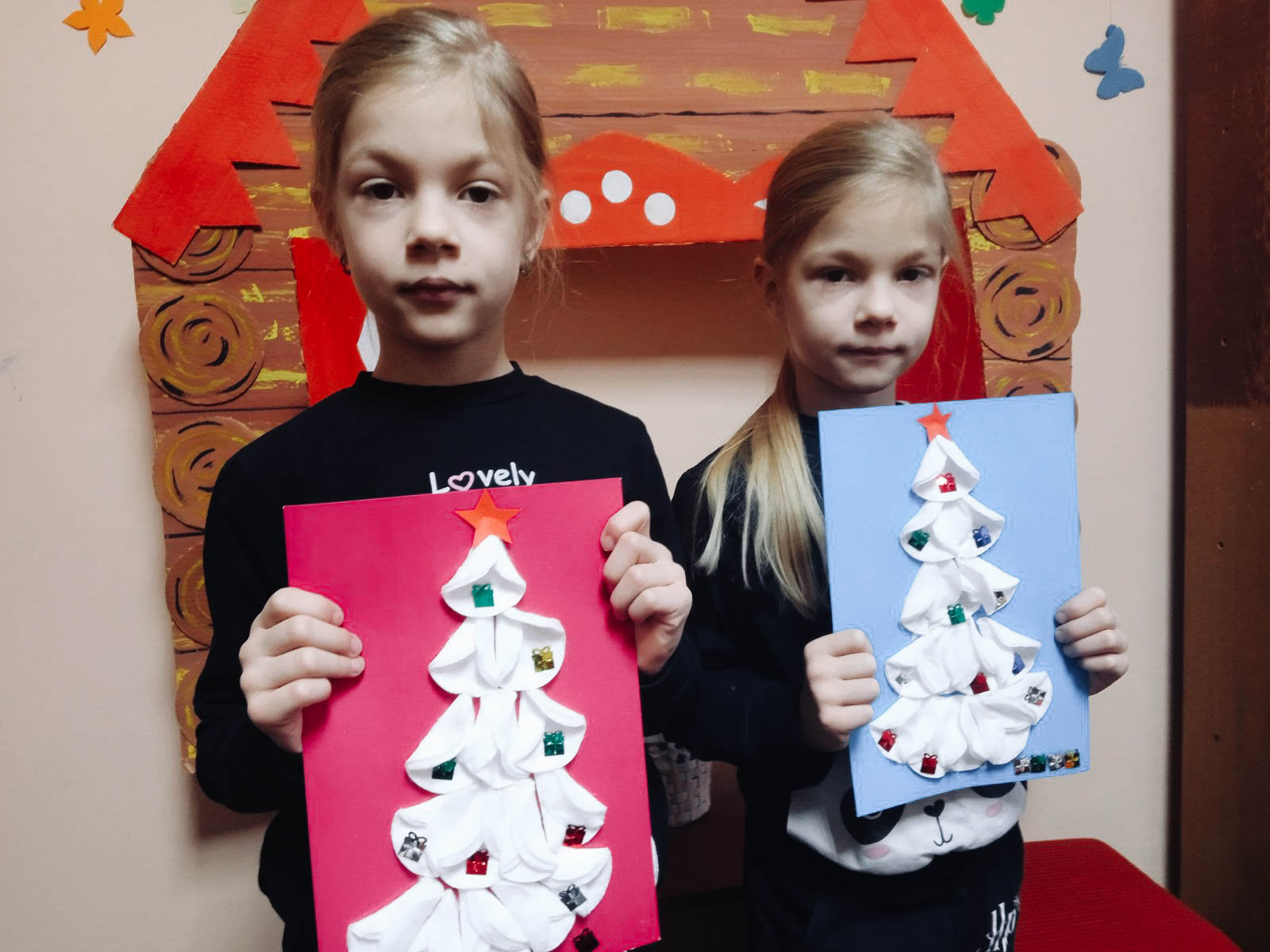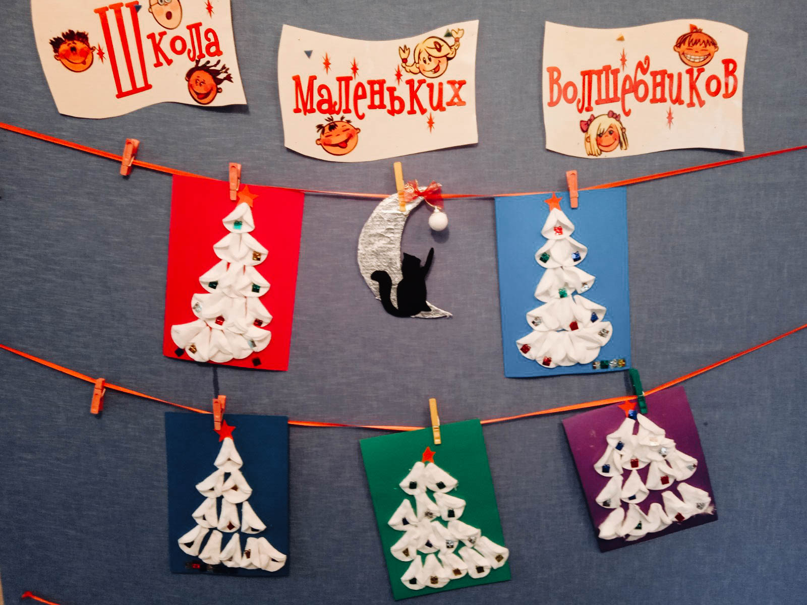 Юные волшебники проиллюстрировали книгу ёлочками из ватных дисков. Получилось очень симпатично.