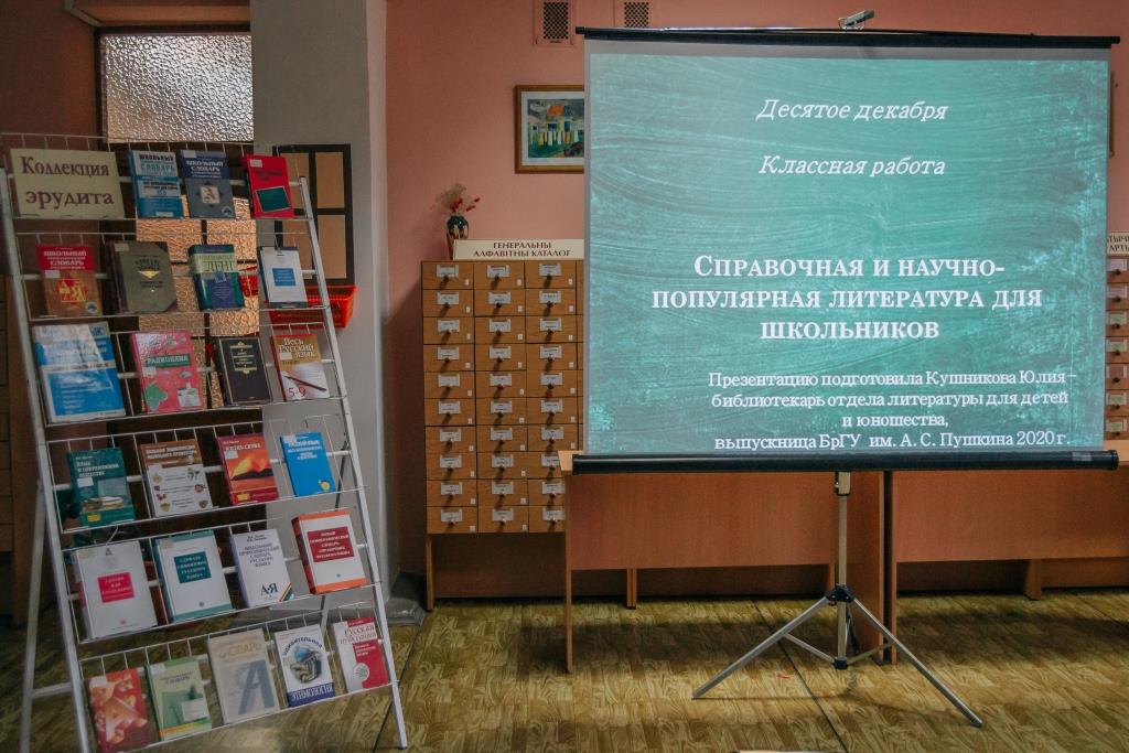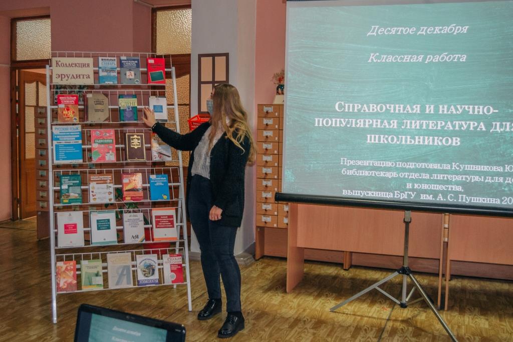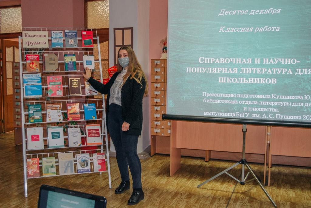 10 декабря 2020 г. в отделе литературы для детей и юношества Брестской областной библиотеки им. М. Горького прошёл день информации для студентов 4-го курса специальности «Русская филология (литературно-редакционная деятельность)» Брестского государственного университета им. А. С. Пушкина. Для будущих учителей библиотекарь Ю. А. Кушникова подготовила презентацию по теме «Научно-популярная и справочная литература для учащихся», которая поможет не только им в работе (составлении конспектов, дидактических сценариев, дидактического материала), но и сделает её более увлекательной и интересной для их учеников. Была проведена ознакомительная экскурсия по отделу.