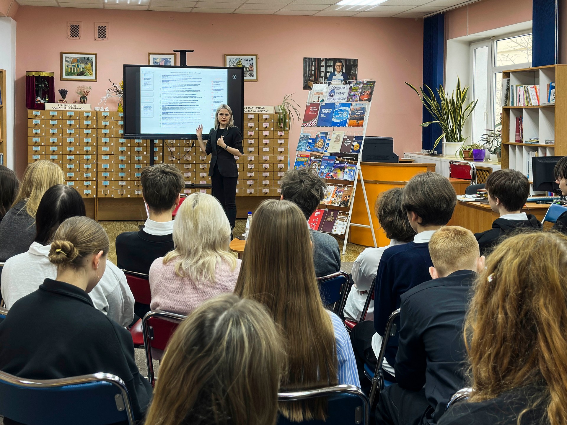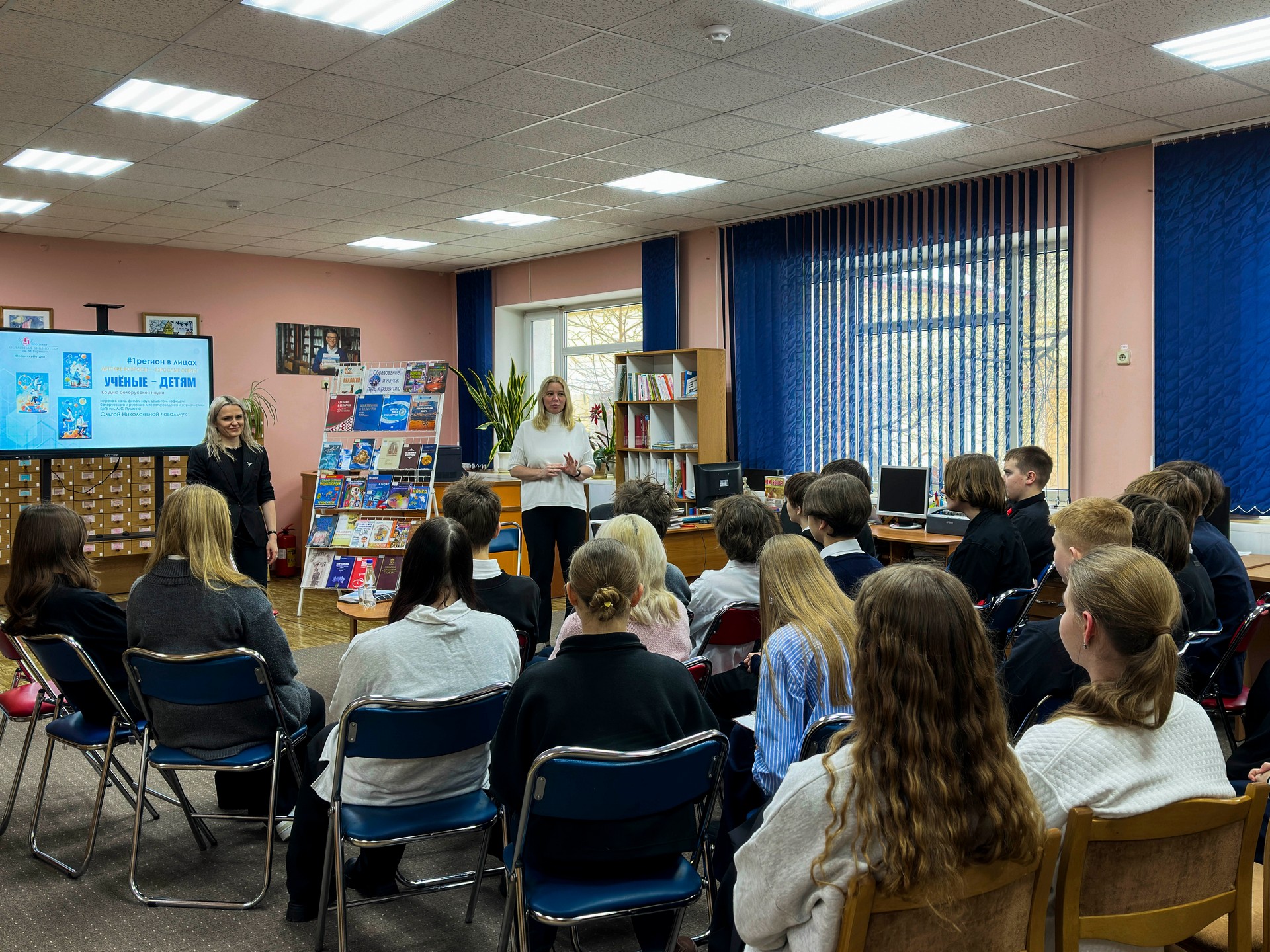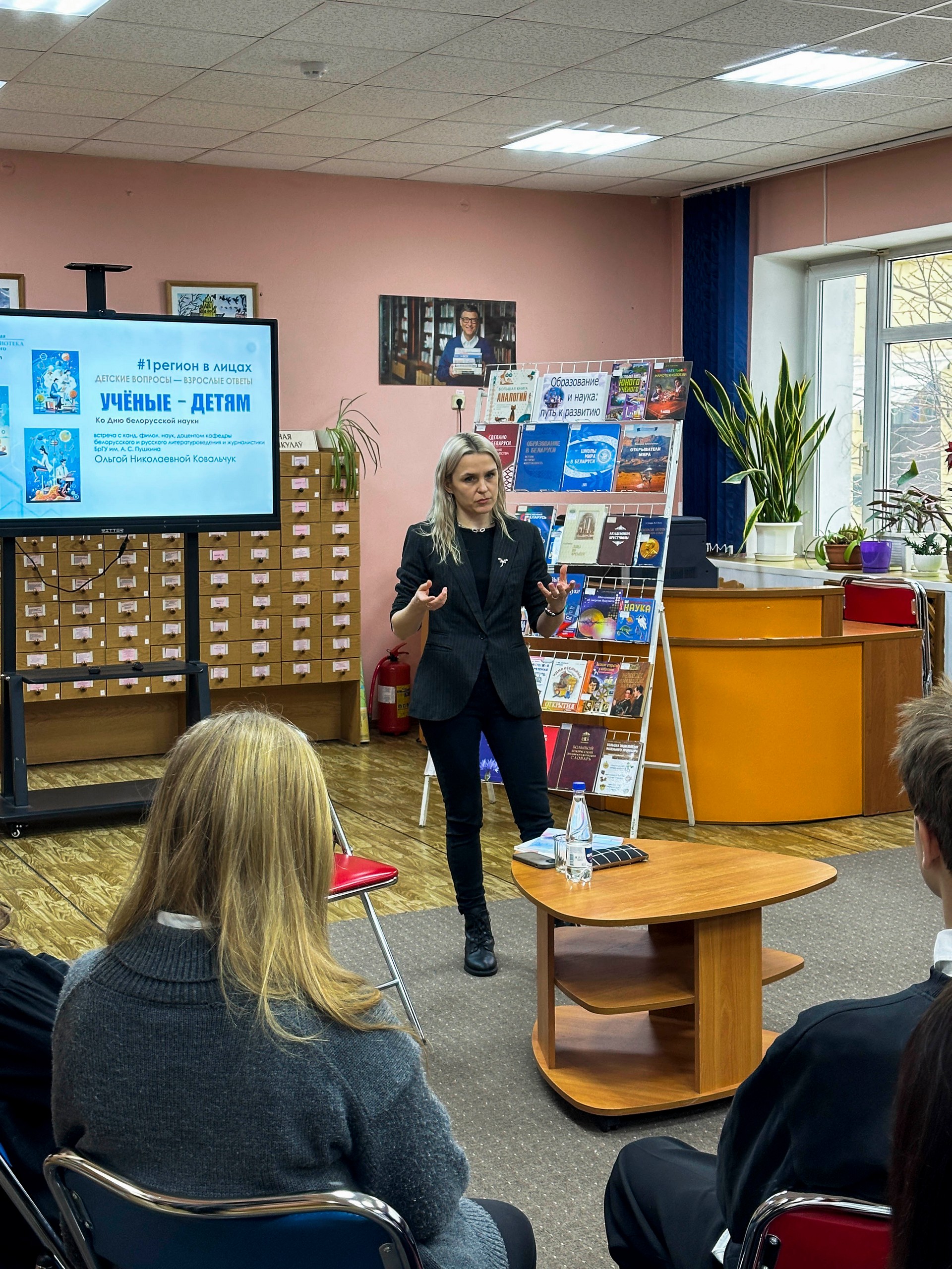 29 января 2026 в юношеском отделе Брестской областной библиотеки в рамках реализации проекта «#1 регион в лицах: детские вопросы — взрослые ответы» состоялась встреча с кандидатом филологических наук, доцентом кафедры белорусского и русского литературоведения и журналистики Ольгой Николаевной Ковальчук. Встреча была приурочена ко Дню белорусской науки и Году белорусской женщины. На мероприятии собрались школьники, которые получили уникальную возможность услышать рассказ о профессии и пути в науку из первых уст.