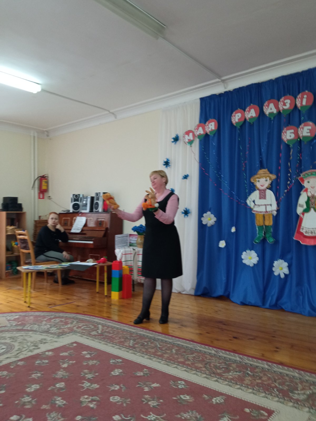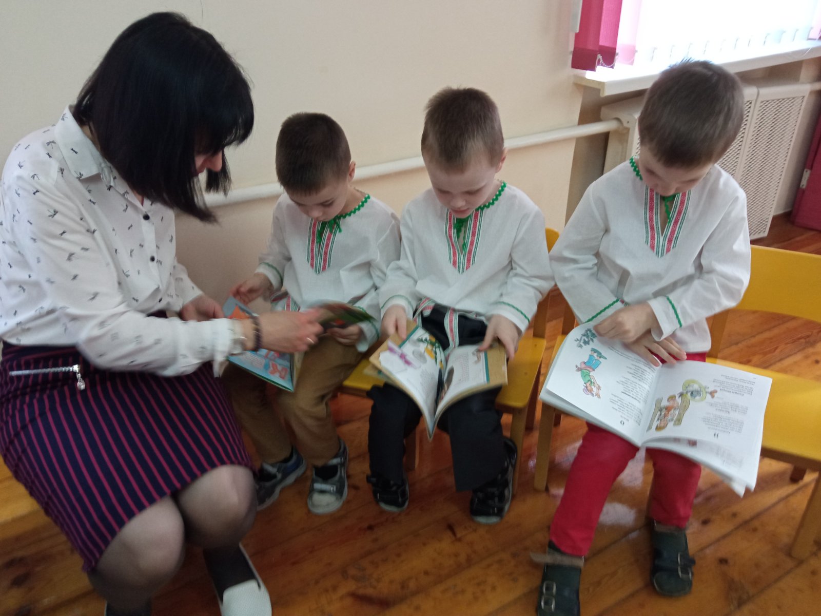 Бібліятэкар В. М. Нікалайчук пазнаёміла дзяцей з беларускімі кнігамі серыі «Маленькі прафесар». Разам змайстравалі вежу з ветлівых слоў