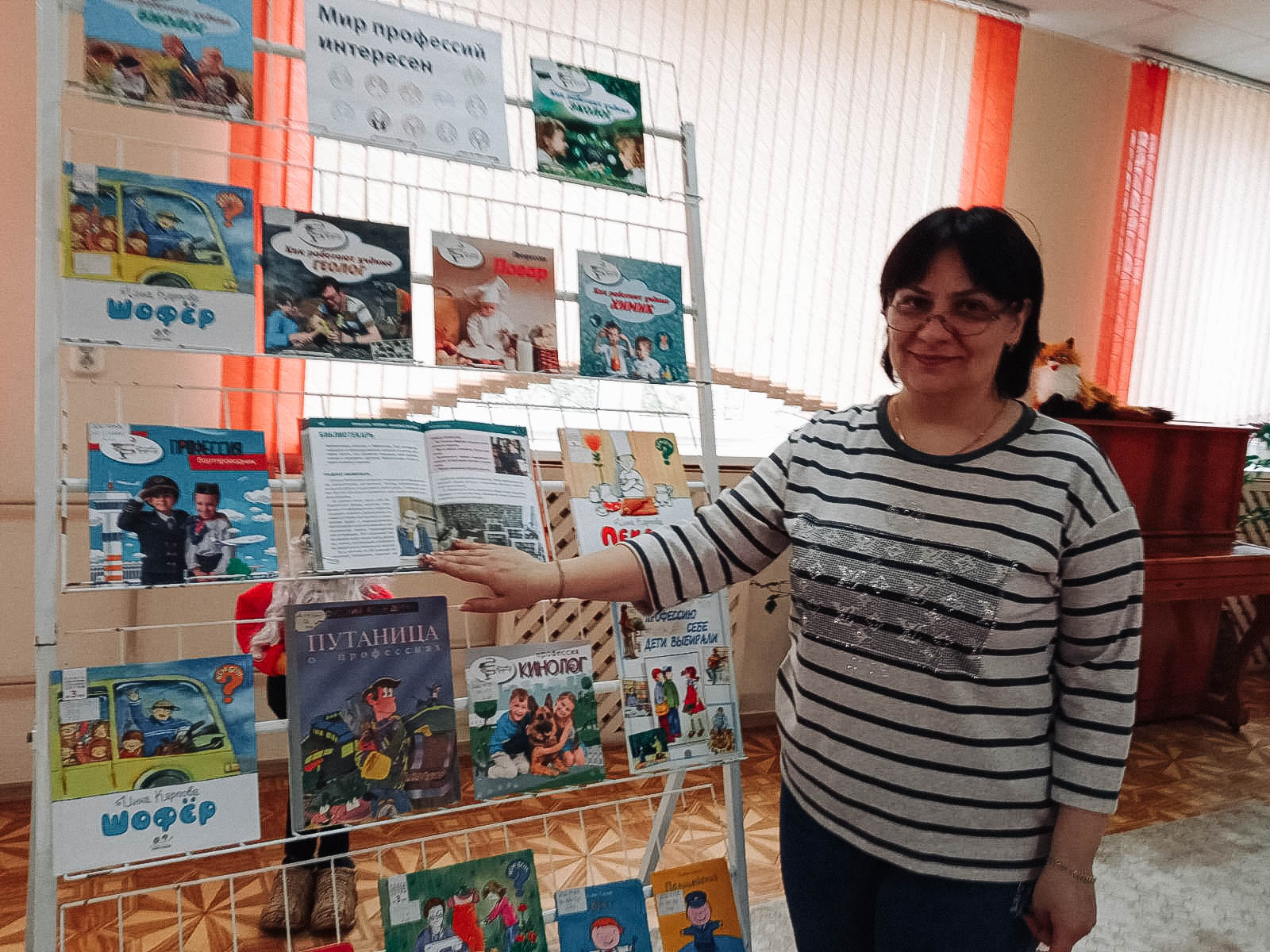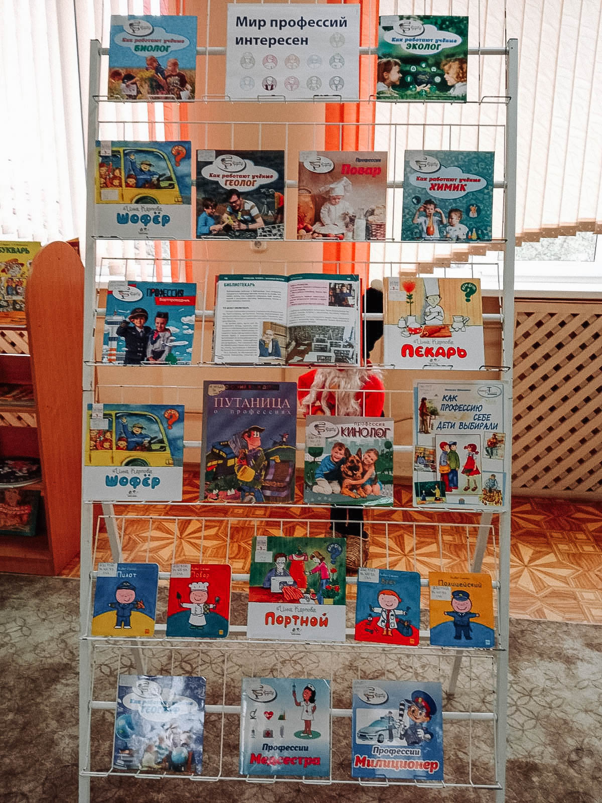 Внимание детей привлекла и книжная выставка о профессиях. Занятие завершилось просмотром мультфильма «Умный портняжка».