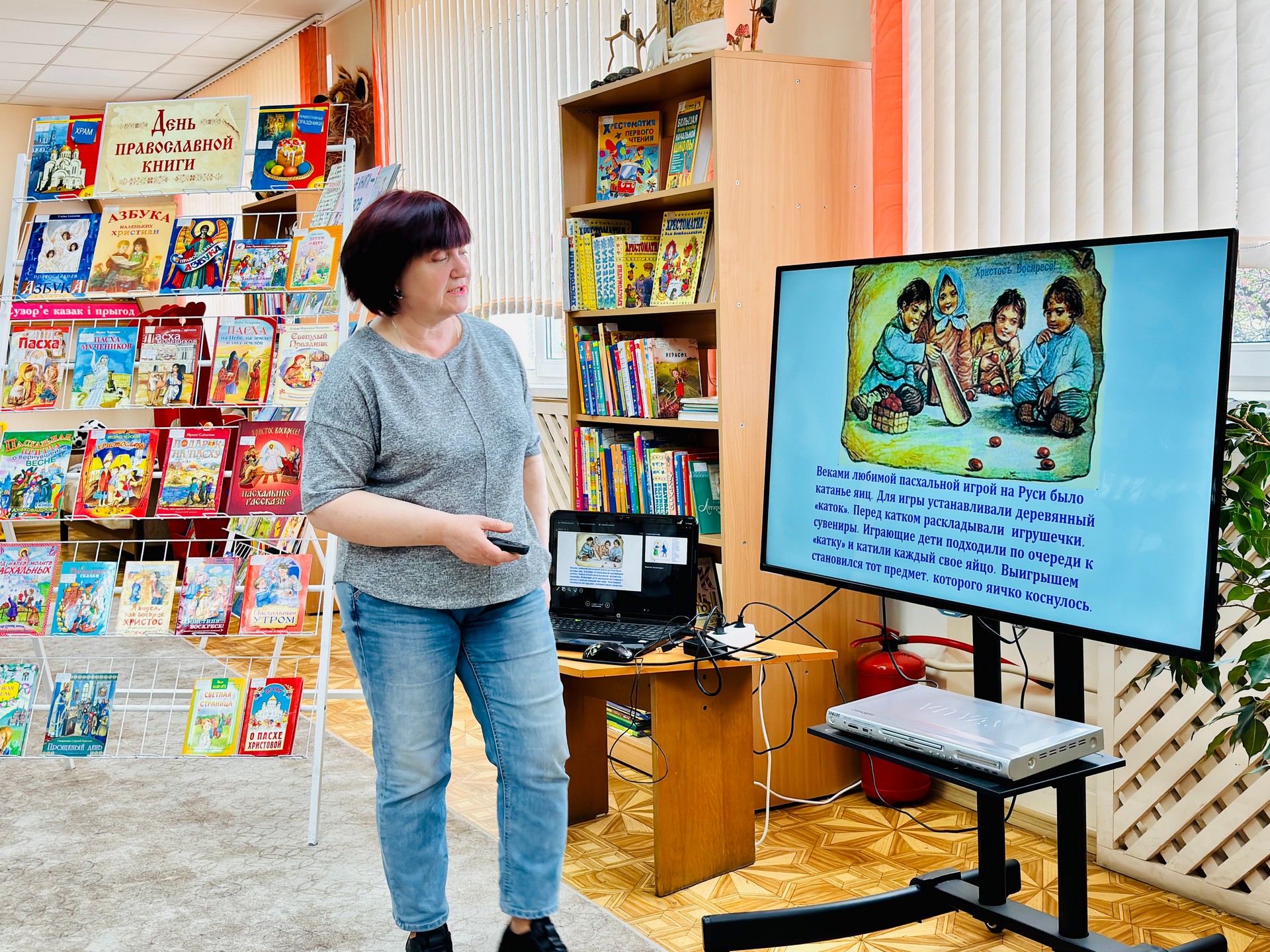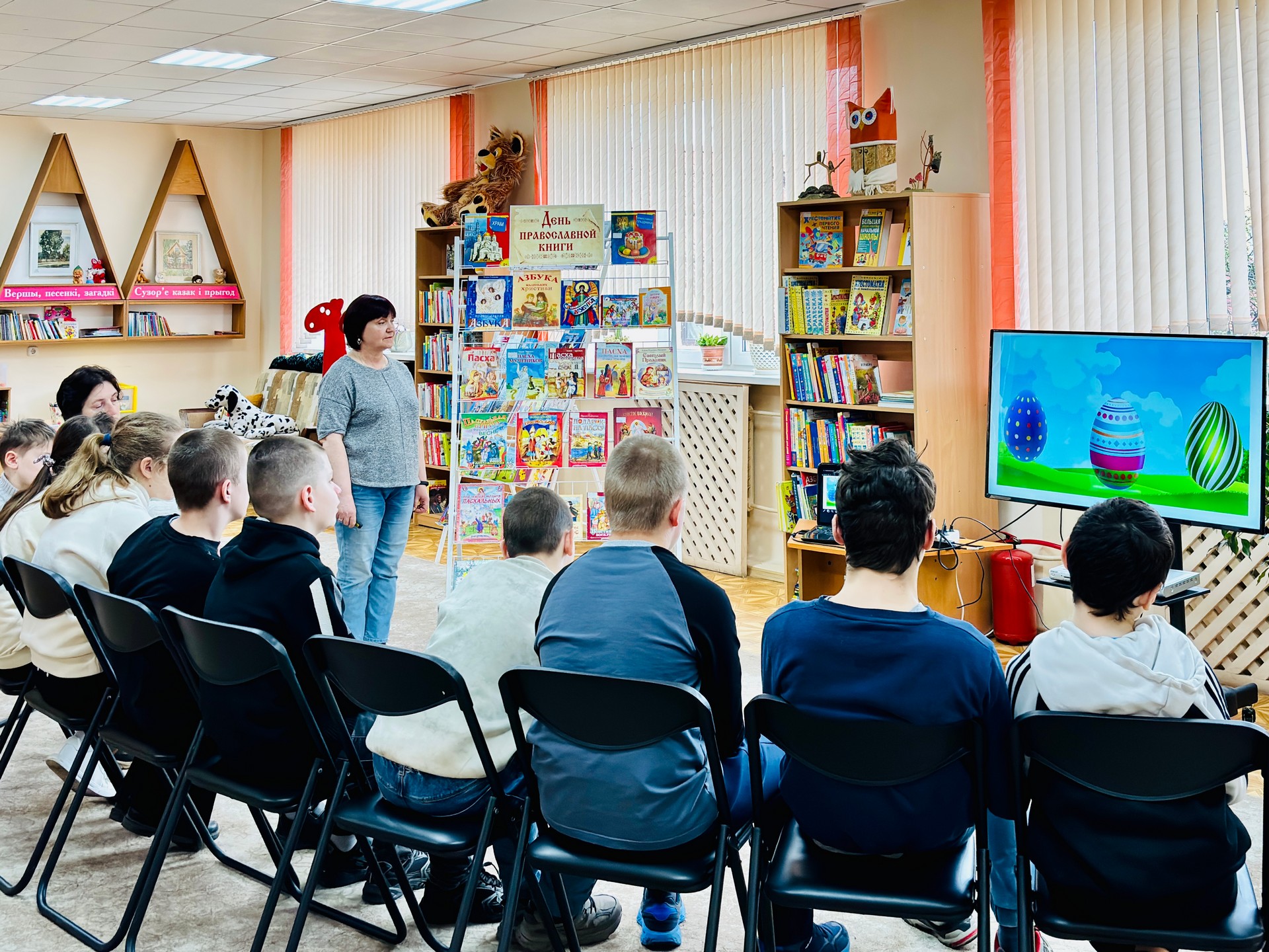 Библиотекари рассказали ребятам историю этого праздника, как он появился и какие старинные традиции с ним связаны. А вы знали, что раньше люди играли с крашеными яйцами? Это было очень весело! Также мы посмотрели замечательный мультфильм, который помог нам лучше понять, как важен этот день. А потом мы читали пасхальные рассказы из книги «Детям о Пасхе Христовой». Эти истории такие добрые и поучительные! После чтения наши гости взялись за цветные карандаши и раскрасили пасхальные яйца. Получилось очень красиво, и эти рисунки украсят класс наших друзей.