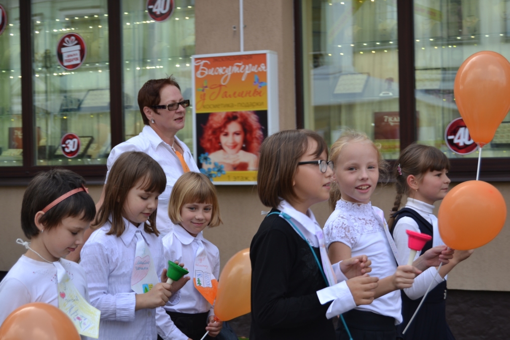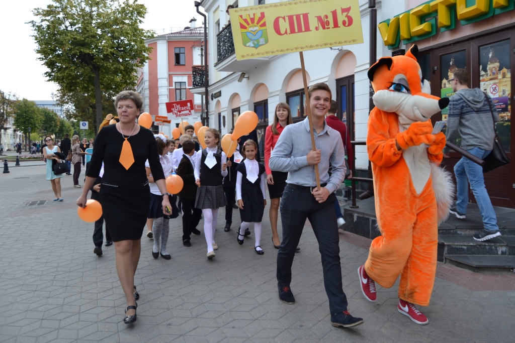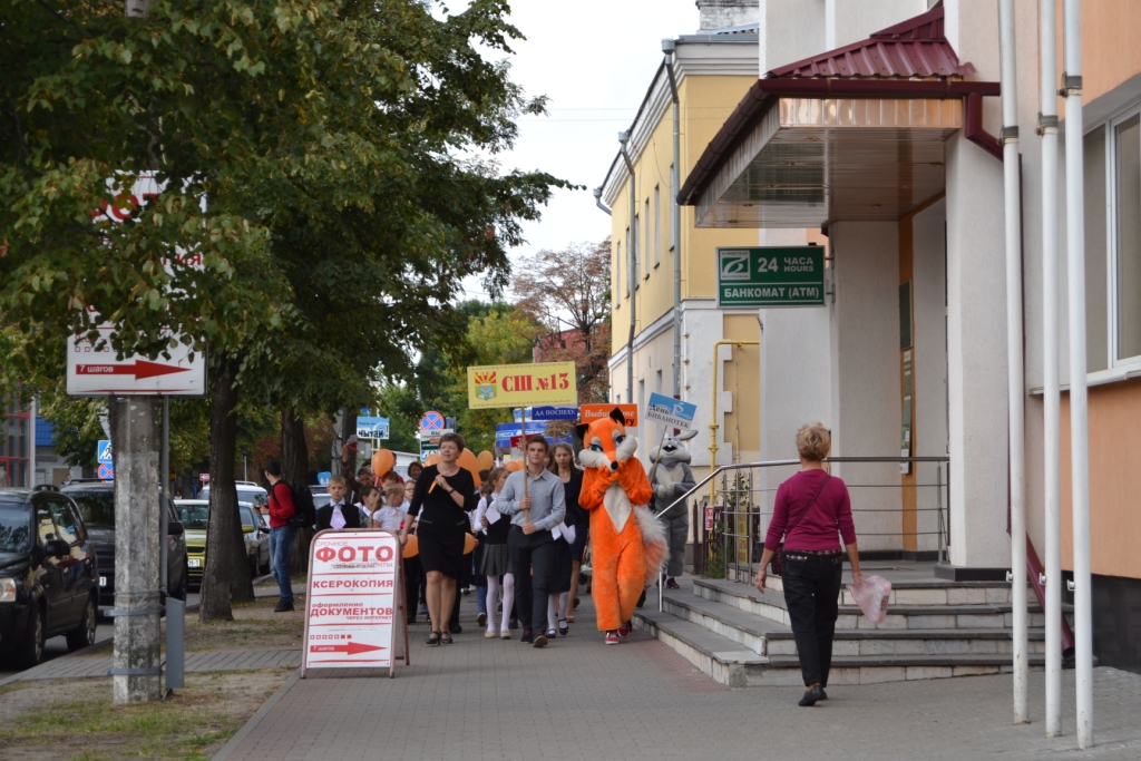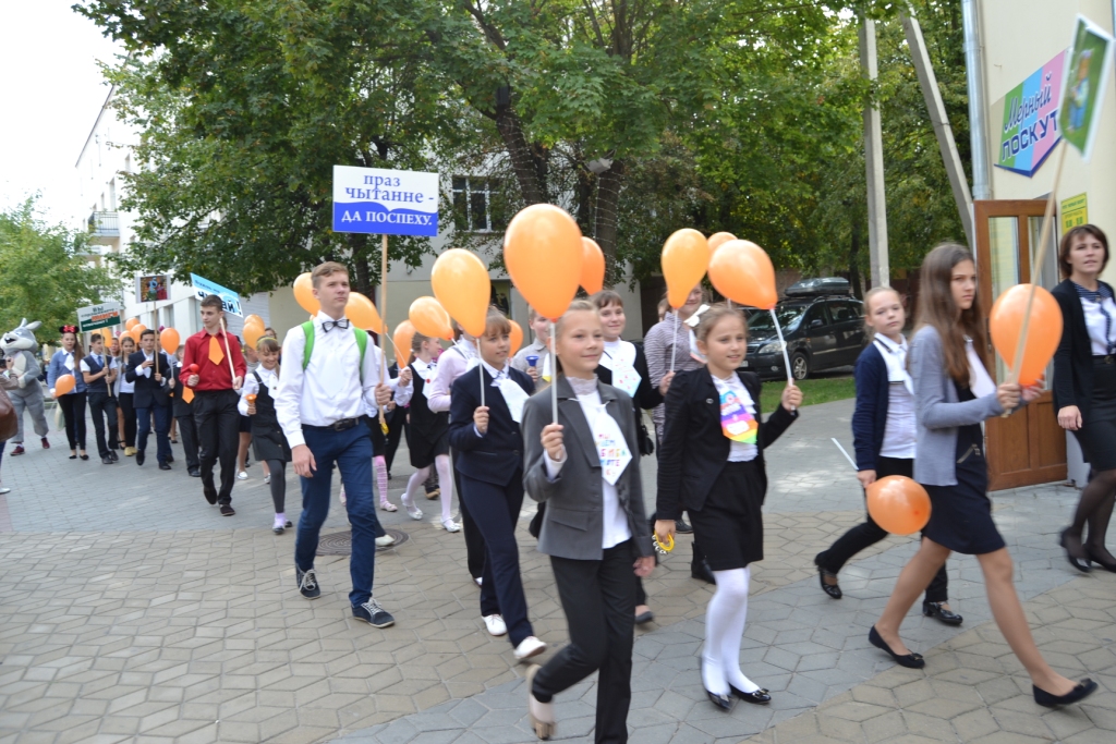 Праздничное шествие возглавили два директора: Тамара Павловна Данилюк (областная библиотека им. М. Горького) и Анна Петровна Волынец (СШ № 13). Красочная колонна прошла по маршруту: проспект Машерова, 33 – улица Куйбышева, 32.