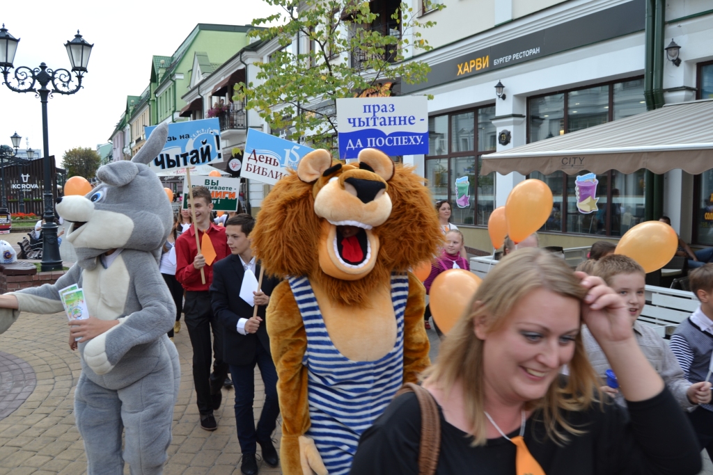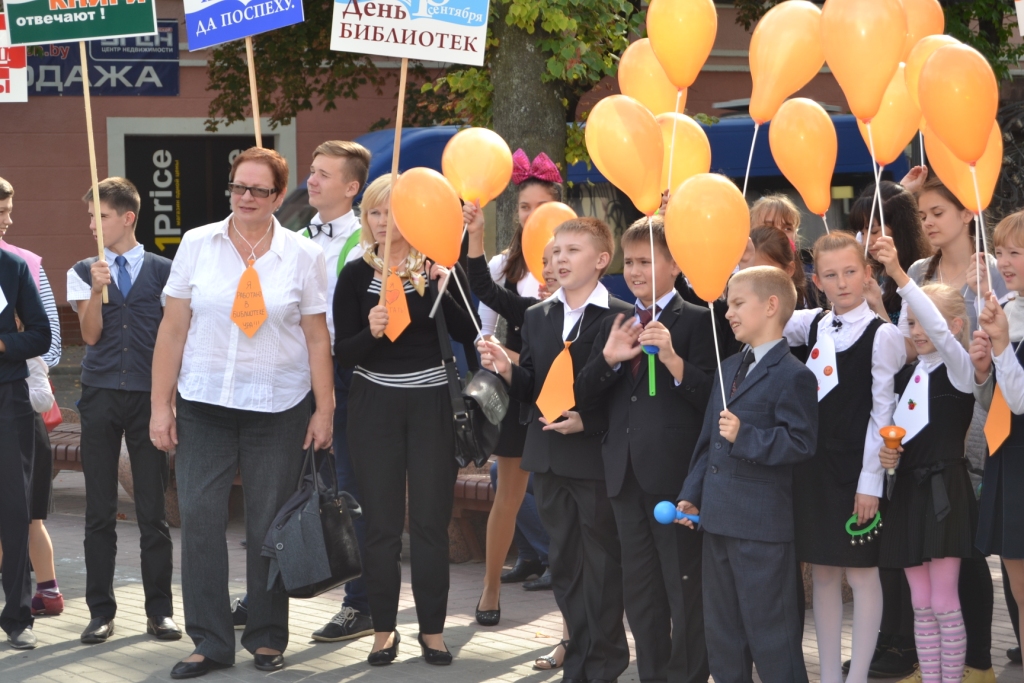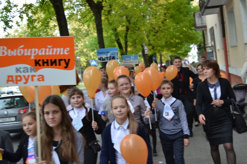 Это было здорово, весело и очень-очень громко! Огромное спасибо средней школе–партнёру № 13: всей администрации, учителям и ребятам, ученикам 4, 5, 8 и 11 классов! По ходу шествия к нам присоединились группы поддержки: читатели, друзья и сотрудники Библиотеки. Никогда в истории нашего города в таком составе и с таким звуковым сопровождением - шумелки, тарахтелки, маракасы, бубенцы, свистульки и речёвки - не отмечался День библиотек. У памятника 1000–летия города Бреста была сделана остановка для общения с прессой, фотографирования на память с замечательными ростовыми куклами и чтения стихов в исполнении Шульган Елизаветы (5 класс), Боричевского Ивана (5 класс), а также Рак Ольги и Гуни Татьяны (8 класс).
