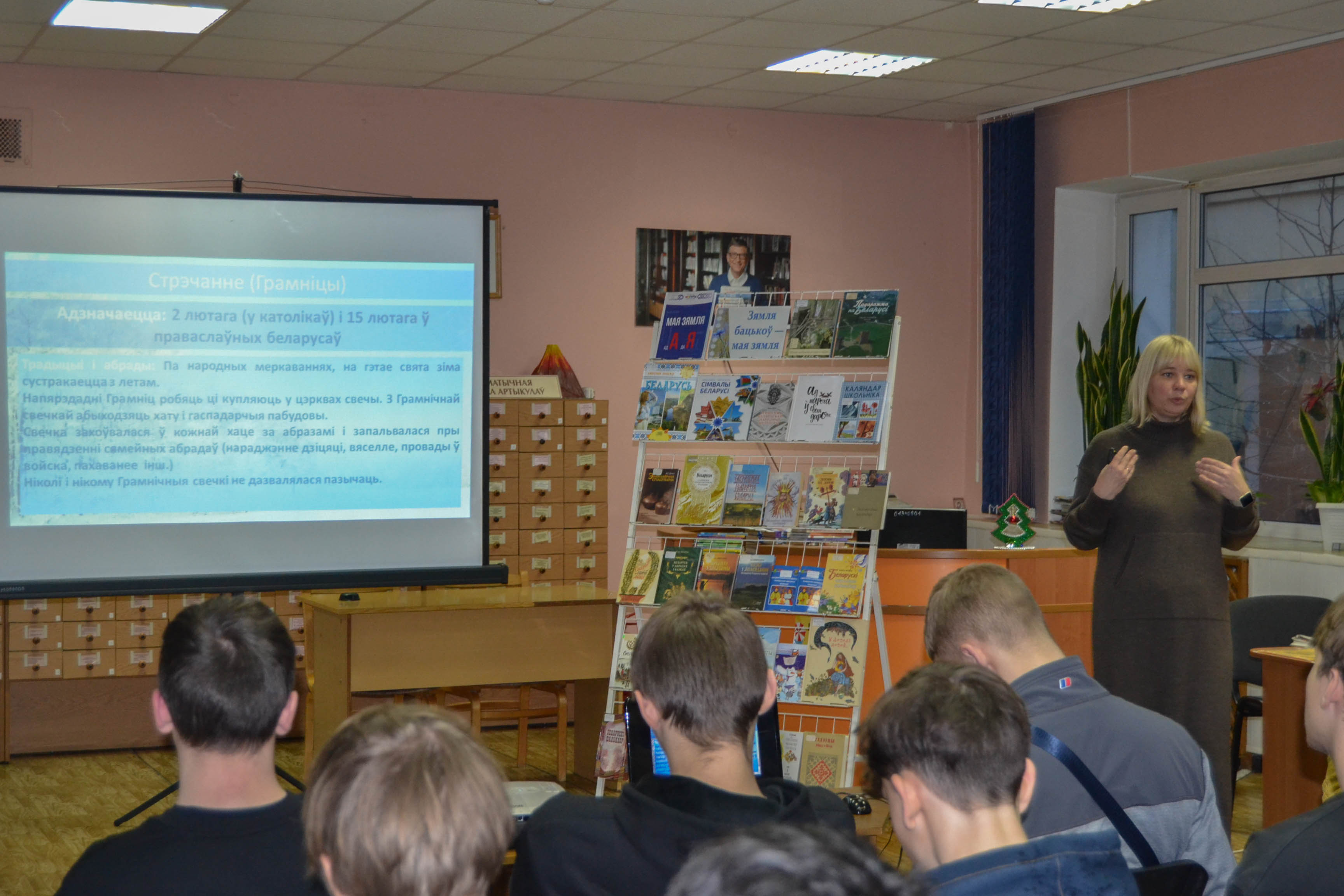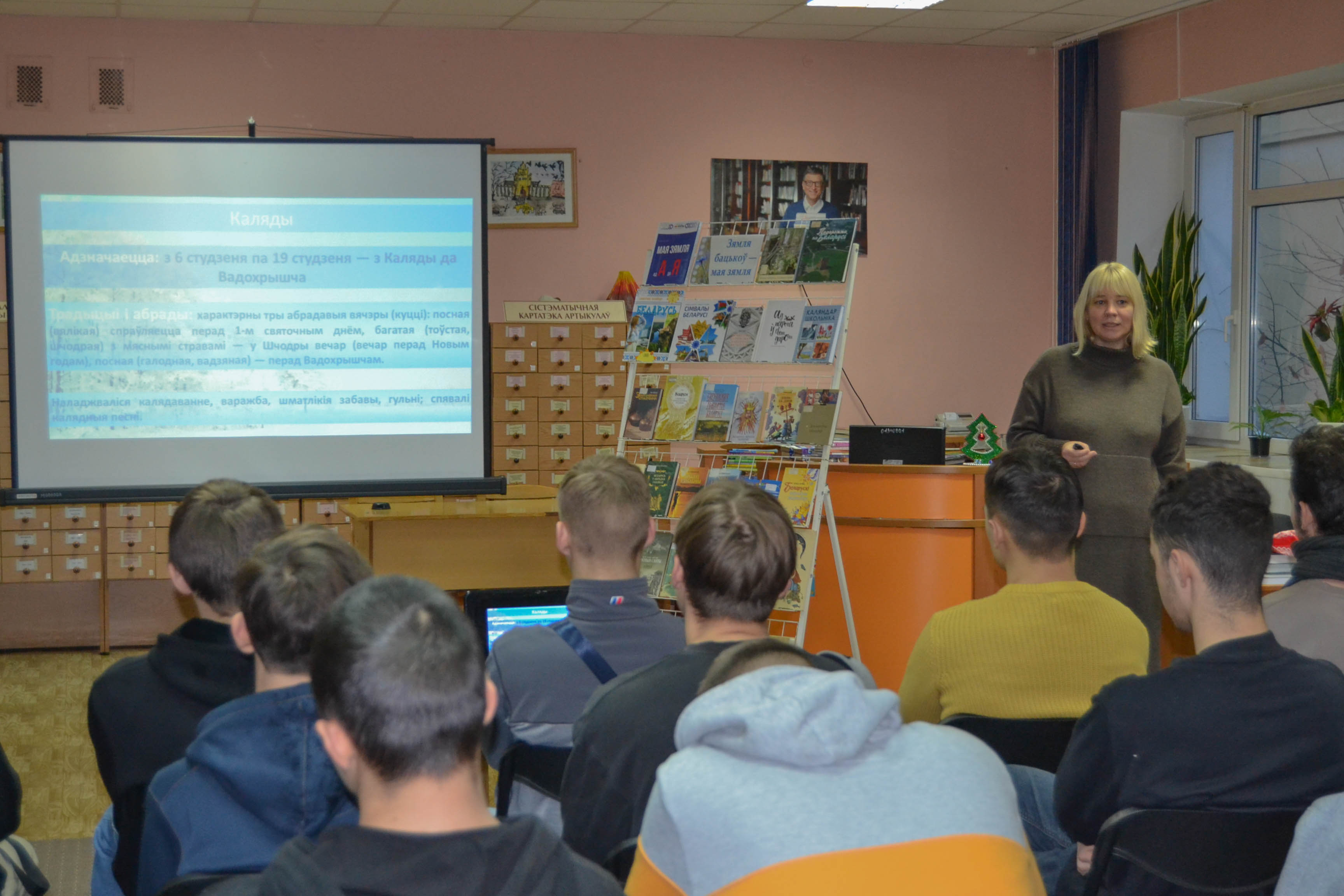 Пазнавальны час «Святочны калейдаскоп: святы і традыцыі нашай краіны» наведалі навучэнцы коледжа прыборабудавання. Асаблівую ўвагу мы надалі святкаваанню калядаў, расказалі пра традыцыі калядавання на беларускіх землях, успомнілі пра правілы гатаваання куцці. Успаміналі яшчэ веснавыя, летнія і восеньскія святы і традыцыі, пры гэтым чыталі вершы, вандравалі па Беларусі і трошачку варажылі на будучае шчасце.