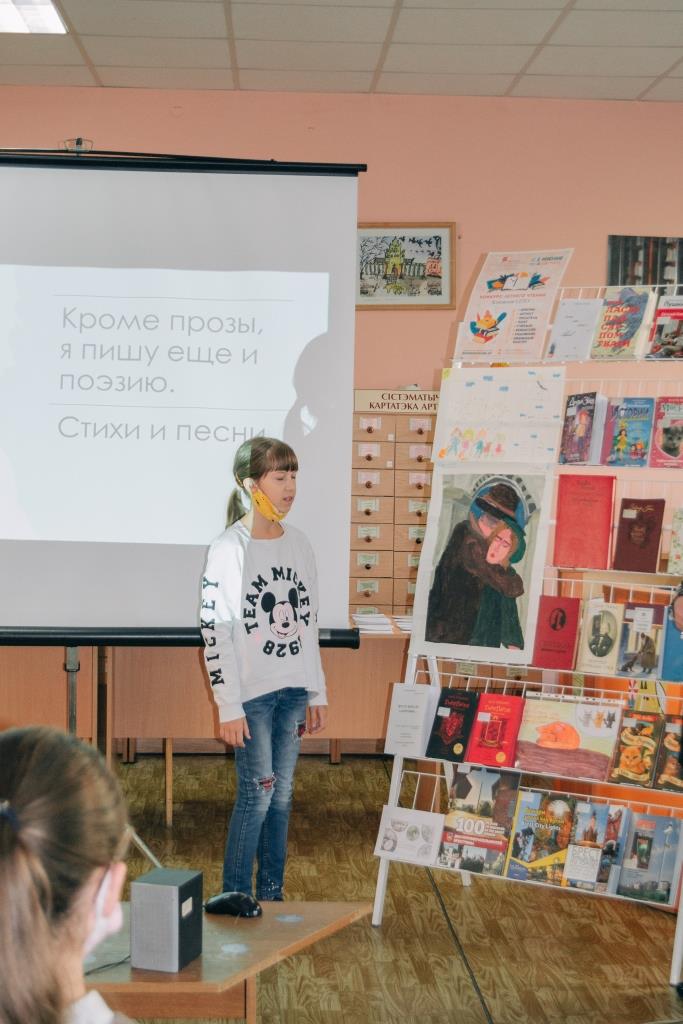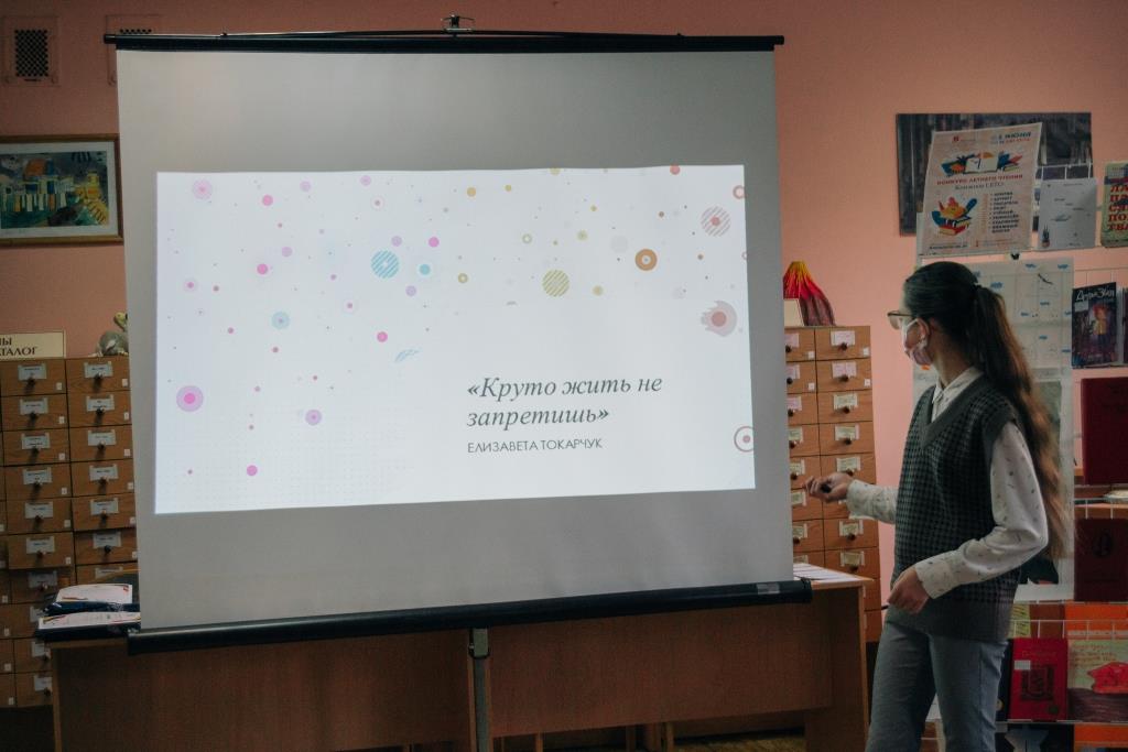 Одним из самых активных читателей отдела является Токарчук Елизавета (гимназия № 1, 8-й класс). Она не только регулярно посещает библиотеку, но и сама, начиная с 8 лет, сочиняет стихи, песни и рассказы, поэтому, как и раньше, выбрала номинацию «Я — писатель». Сегодня в её коллекции уже немало интересных приключенческих, фантастических и философских произведений: «Одна на планете Земля», «Начать всё с чистого листа», «Они за нами следят», «Принц Чарльз» и др. На конкурс она принесла свою автобиографическую работу «Круто жить не запретишь…», которую и презентовала на мероприятии.