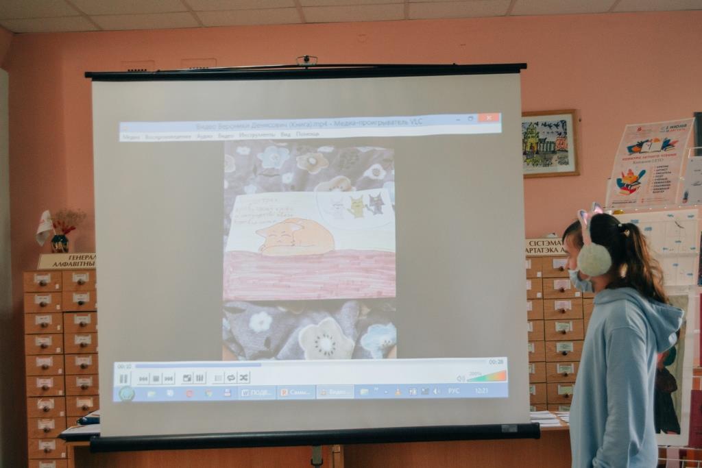 Не осталась незамеченной и одна из новых номинаций летнего конкурса «Я — книжный блогер». Вероника Денисович (СШ № 3, 6-й класс) прислала нам, а затем показала видеоролик, в котором рассказала о книге Эрин Хантер «Знак трёх» из цикла «Коты-воители», представила рисунки к ней и booklook (фотопортрет книги на фоне предметов, раскрывающих её содержание).