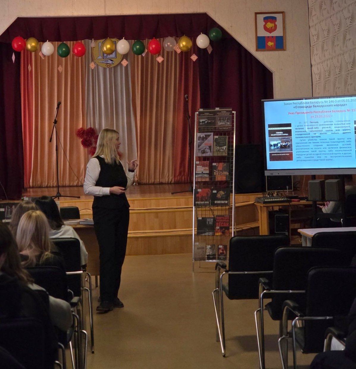 С помощью мультимедийной презентации слушатели погрузились в тему нацистской оккупационной политики на территории Беларуси. Была подробно освещена деятельность концентрационных лагерей, в том числе лагерей в Колдычево и Тростенце. Людмила Викторовна познакомила с документальными свидетельствами о бесчеловечных условиях содержания узников (голод, изнурительный труд, массовые болезни и отсутствие медицинской помощи).