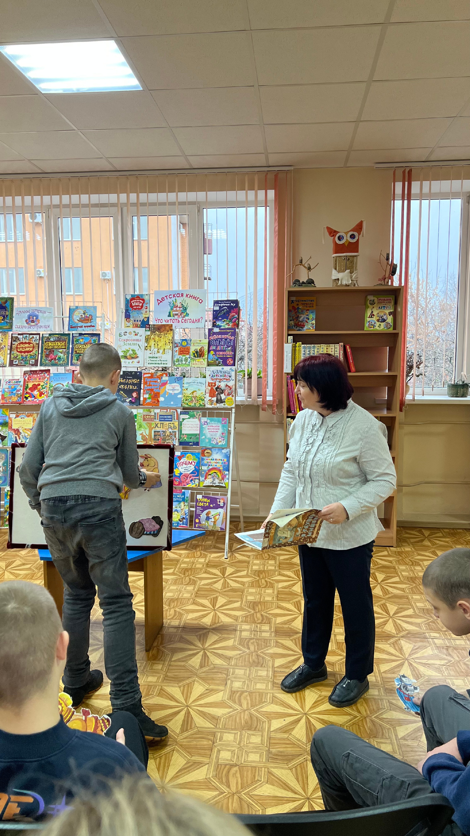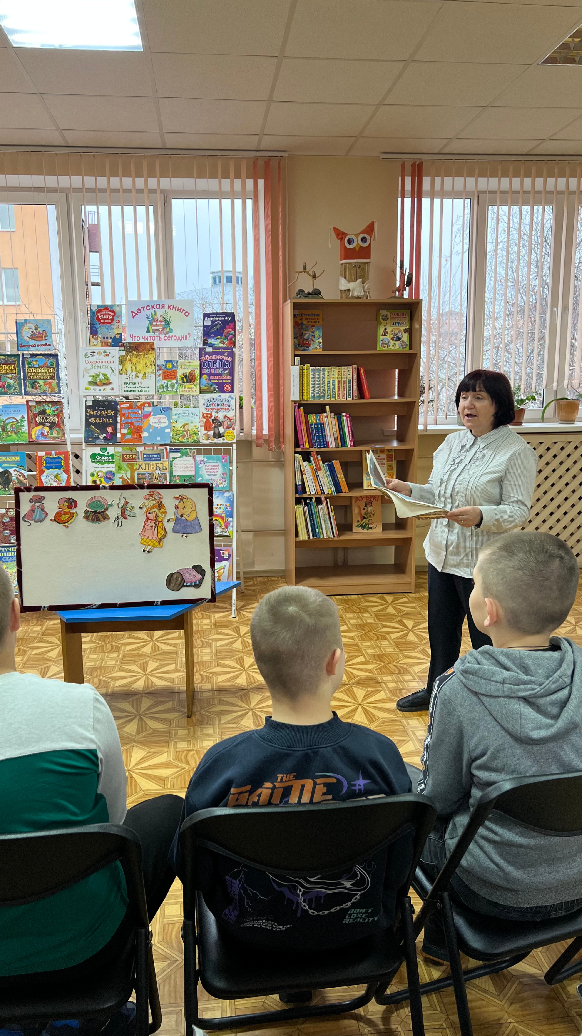 Затем началась творческая часть встречи. С помощью фланелеграфа дети смогли не просто послушать, но и «увидеть» сказку, перемещая яркие фигурки персонажей по специальному экрану. Это упражнение прекрасно развивает мелкую моторику, воображение и позволяет стать соавтором действия.
