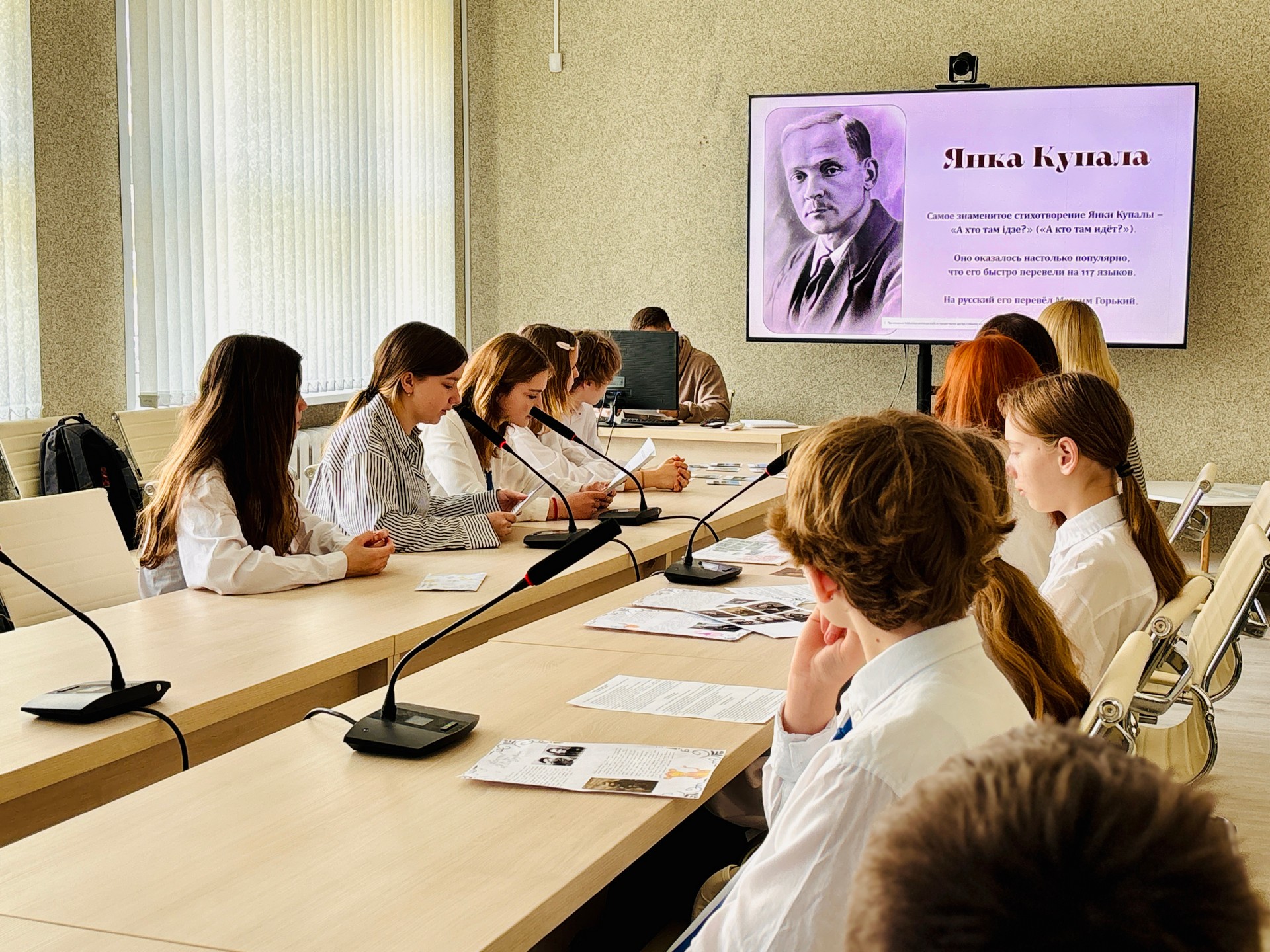 Разговор, естественно, перешёл к литературе. Ребята рассказали о творчестве Якуба Коласа, Янки Купалы, Владимира Короткевича, Василя Быкова и Алоизе Пашкевич (Тётке). Гости из Пензы в ответ рассказали о своих литературных ориентирах — Михаиле Лермонтове, Александре Куприне, Сергее Есенине, Антоне Чехове — и показали на фотографиях свою школу и любимые места города.