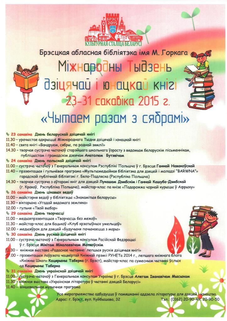 • В Бресте стартует международная Неделя детской и юношеской книги «Чытаем разам з сябрамi» [Электронный ресурс] / Вечерний Брест. – Брест, 2015. – Режим доступа:http://www.vb.by/culture/books/nedelya_knigi.html. – Дата доступа : 23.03.2015.