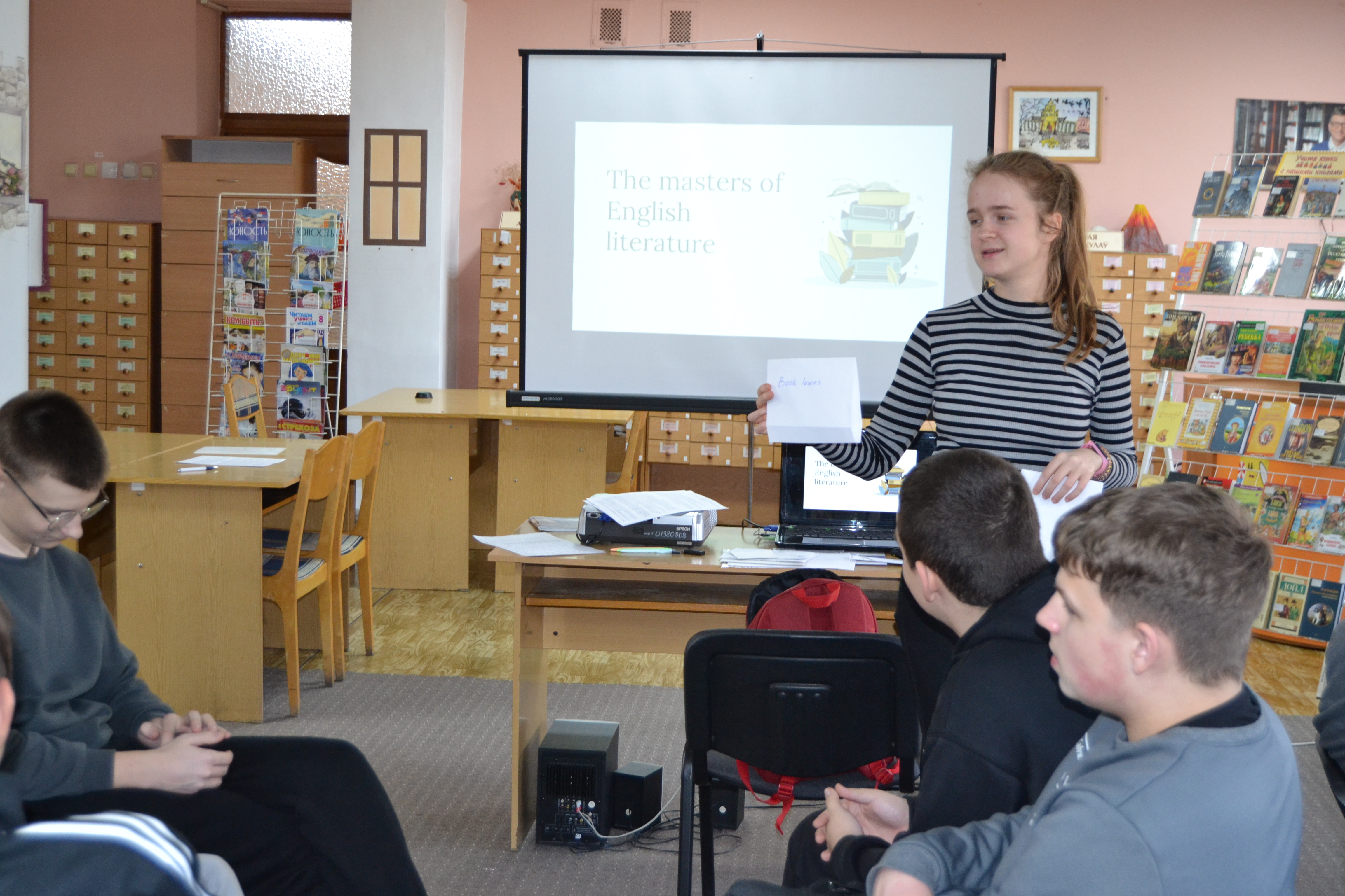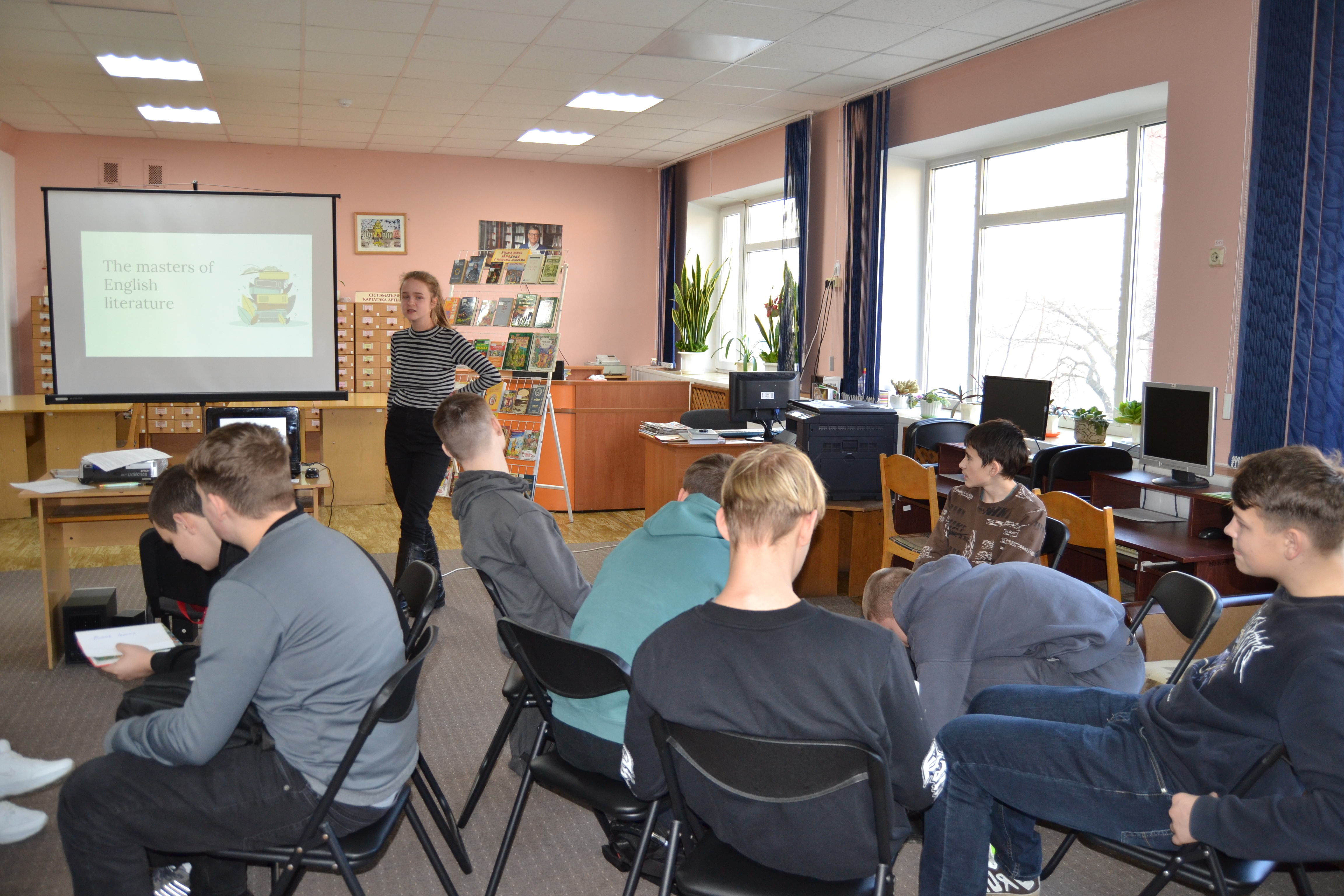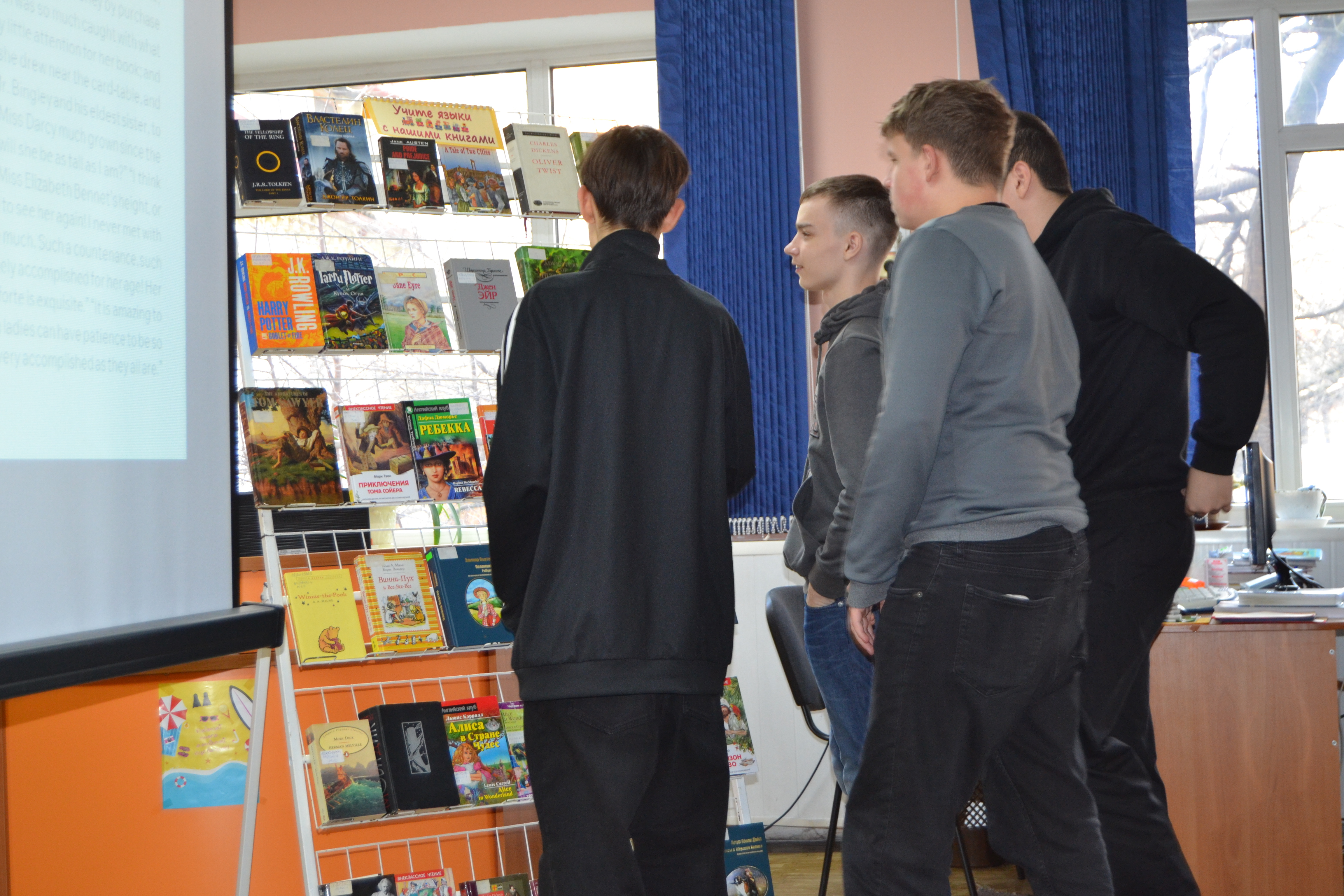 Учащиеся колледжа приборостроения и их прекрасный учитель Вероника Валерьевна провели внеурочное мероприятие в юношеском отделе, где соревновались на звание лучшего знатока британской литературы. Ребята узнавали интересные факты из мира книг, знакомились с британскими писателями и их произведениями, читая отрывки в оригинале, смотрели экранизации и узнавали авторов, по мотивам книг которых были поставлены фильмы.