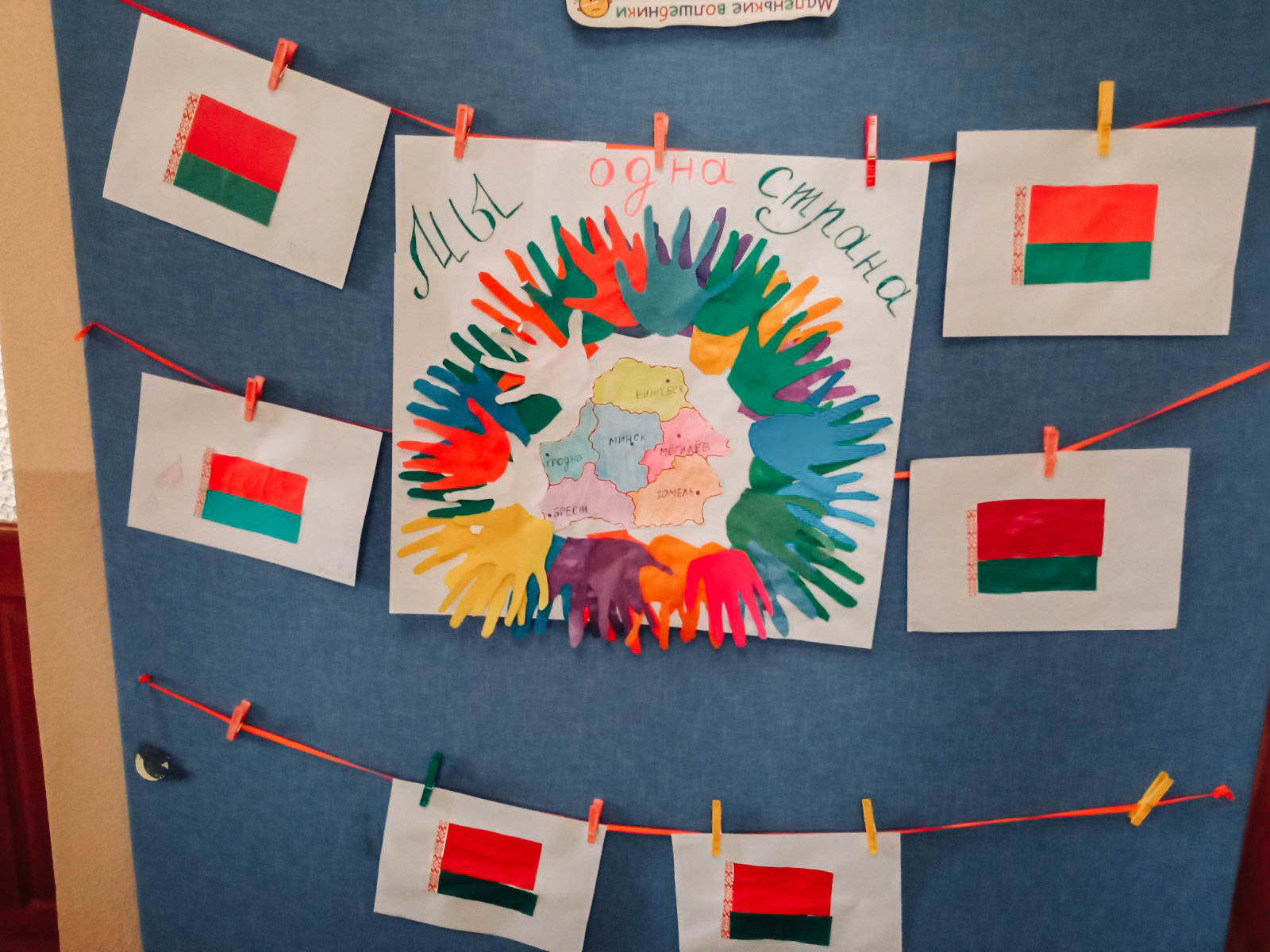 Старшая группа на занятии подробно изучала символику культуру, традиции, законы Беларуси. В этом им помогла книга «Маленький профессор» из серии «Государственные символы Республики Беларусь». Вместе ребята сделали плакат «Я, ты, он, она — мы единая Страна».