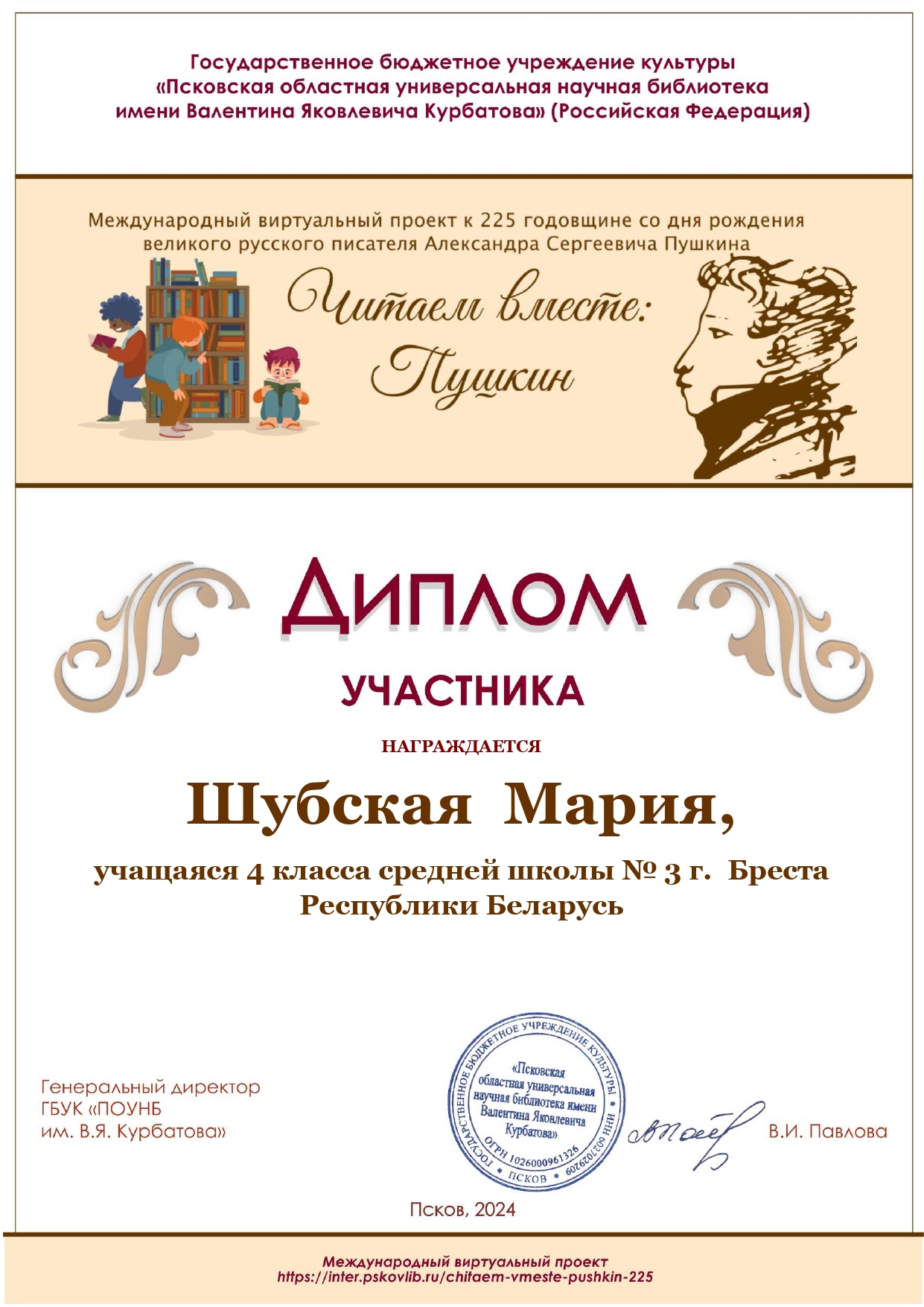 Брестская областная библиотека им. М. Горького присоединяется к международному виртуальному проекту «Читаем вместе: Пушкин», приуроченному к 225-й годовщине со дня рождения великого русского писателя Александра Сергеевича Пушкина. Инициаторами проекта выступили Псковская областная универсальная научная библиотека им. В. Я. Курбатова (Российская Федерация) и Витебская областная библиотека им. В. И. Ленина.