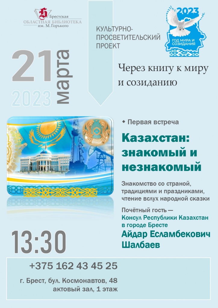 21 марта состоялось первое мероприятие проекта «Казахстан: знакомый и незнакомый» — встреча читателей детского отдела библиотеки и учащихся 4 «Б» класса начальной школы № 5 с Консулом Республики Казахстан в городе Бресте Шалбаевым Айдаром Есламбековичем.