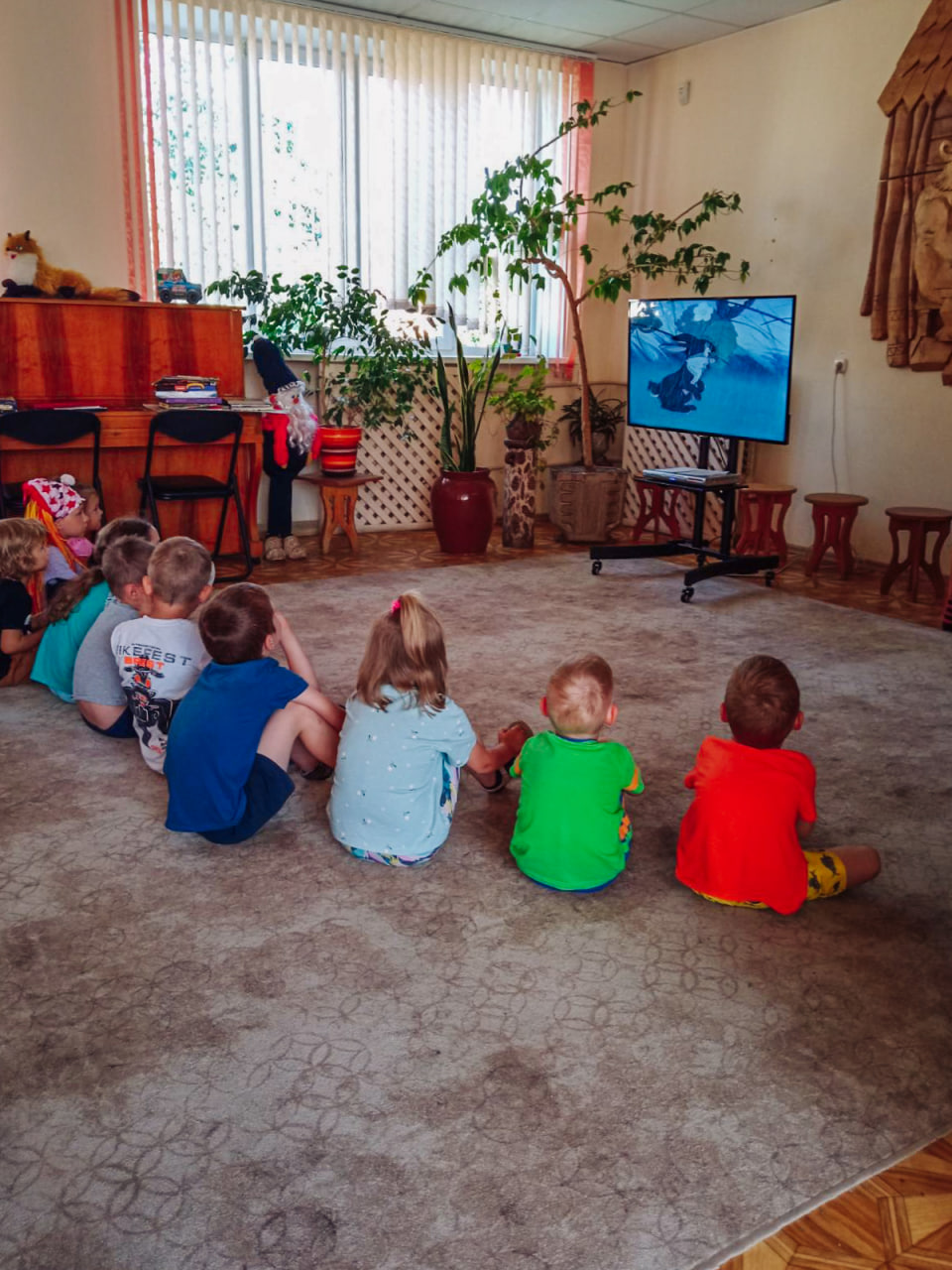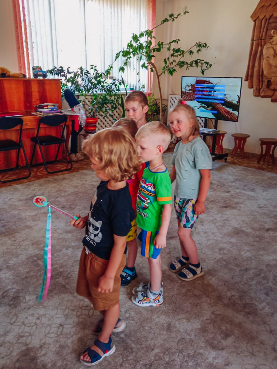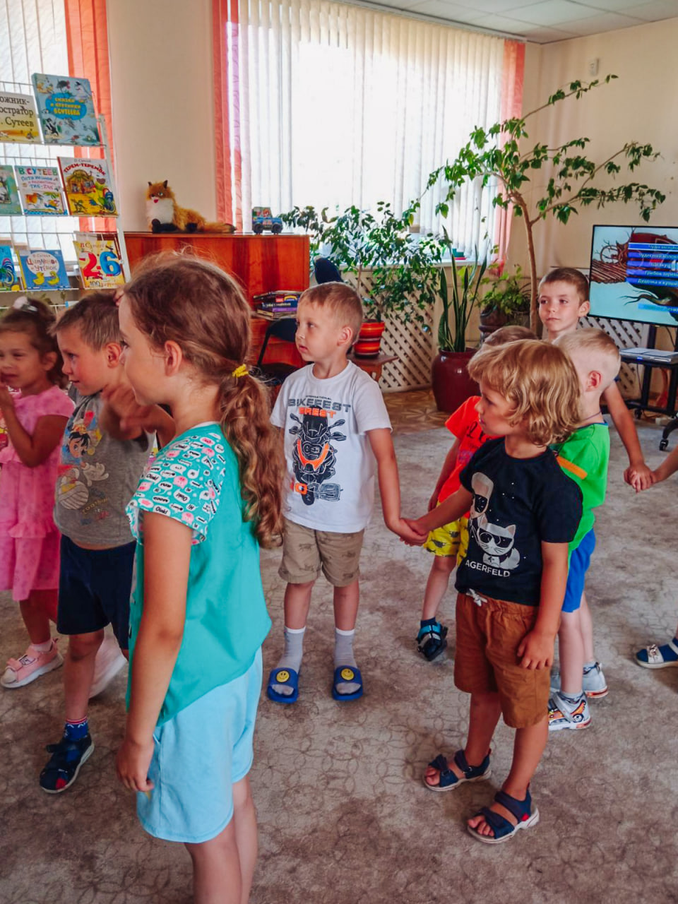 На этом знакомство с автором не закончилось. Ребята приняли участие в игре «Ручеёк», смотрели мультфильмы «Кораблик» и «Под грибом».