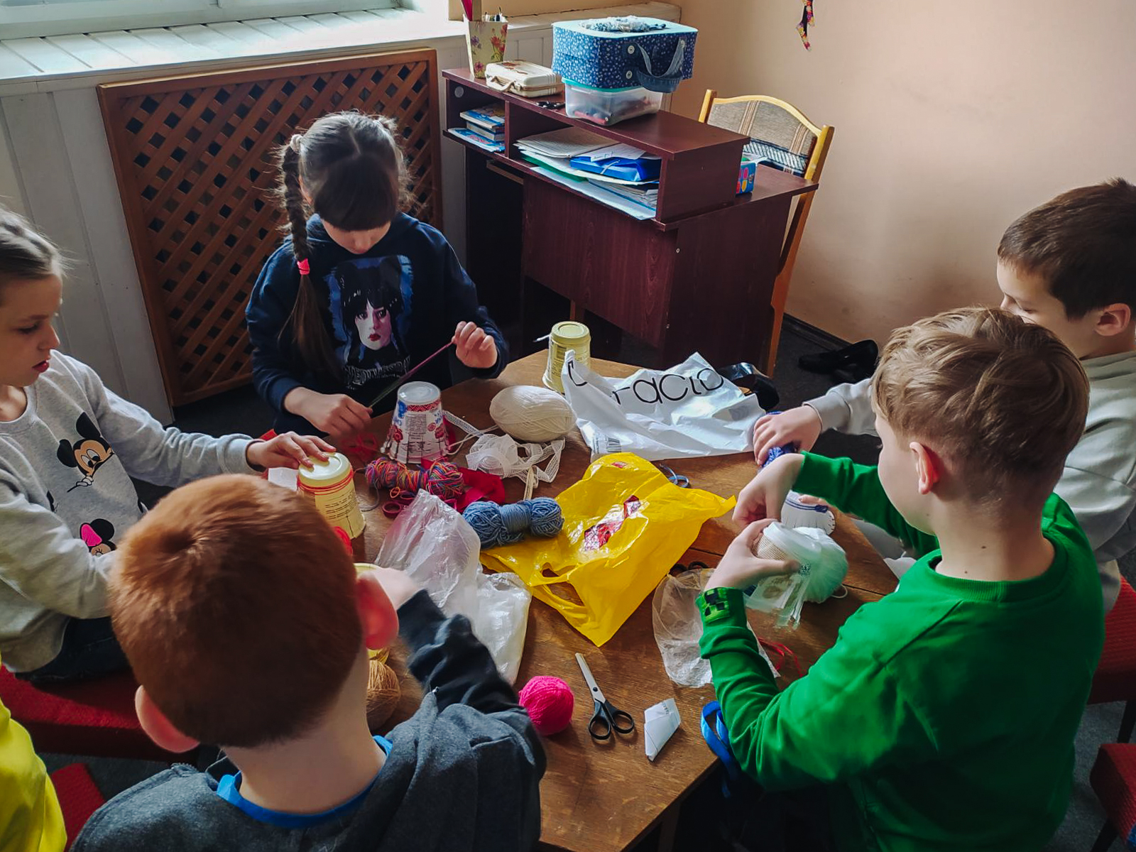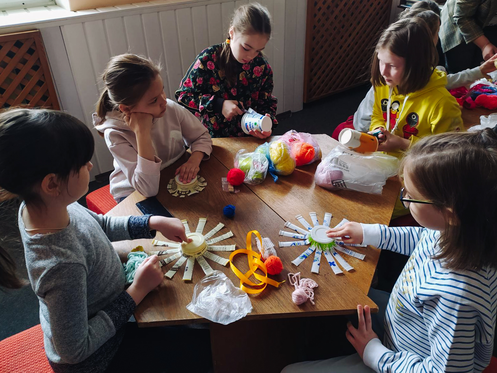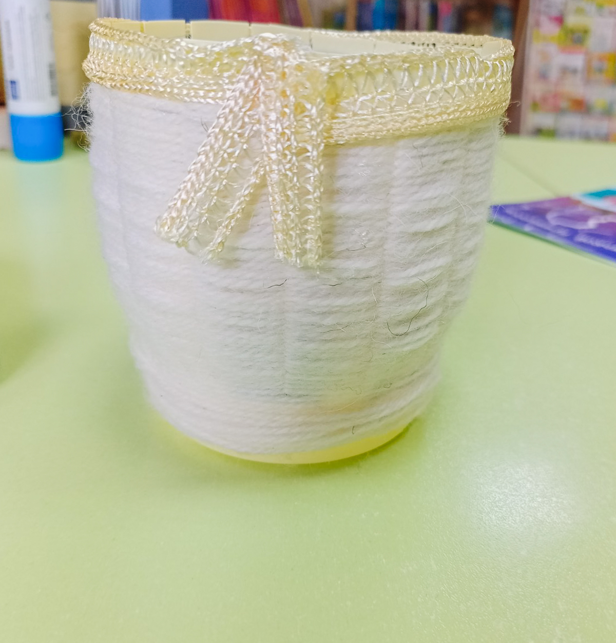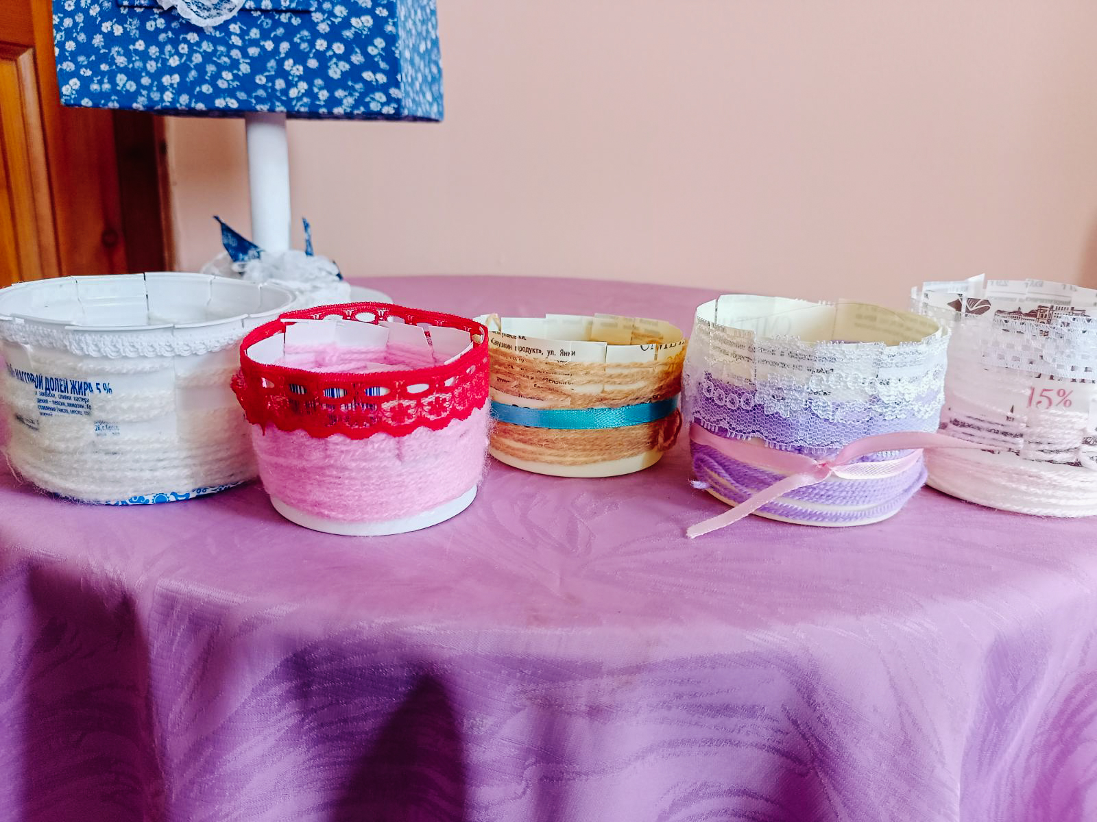 На мастер-классе учащиеся сделали корзинки из ниток и стаканчиков из-под сметаны. Использовалась техника лозоплетения. Работы украсили кружевом. Получились красивые корзинки.