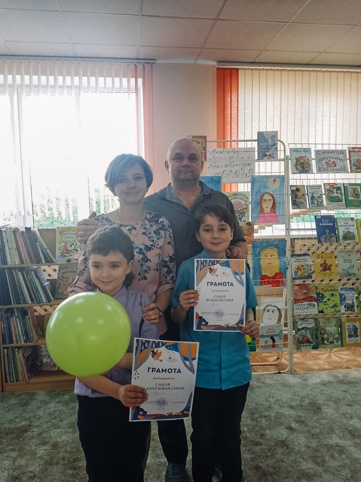 А все семьи, участвующие в конкурсах, были отмечены грамотами от администрации библиотеки. Лучшей «Талантливой семьей» стала семья Пукита: папа — Андрей Александрович, мама — Татьяна Васильевна, сыновья Сергей и Коля, они же получили грамоту и как «Самая большая семья», а вот «Самой читающей семьей» стала семья Соколовских: папа — Владимир Александрович, мама — Ольга Викторовна и дочь София.