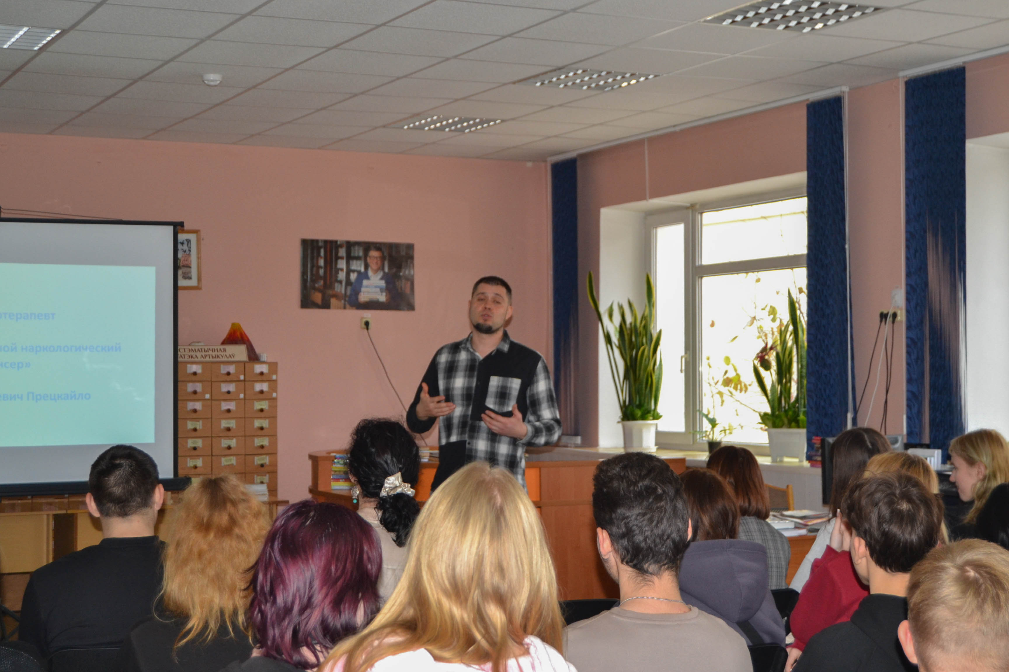 Важность профилактики вредных привычек, зависимостей и ВИЧ в подростковой среде неоспорима. 28 ноября 2023 г. в юношеском отделе врач-психотерапевт УЗ «Брестский областной наркологический диспансер» Владислав Игоревич Прецкайло рассказал учащимся колледжей лёгкой промышленности и приборостроения о путях формирования зависимостей, о том, как относиться к давлению со стороны сверстников или окружения, предлагающих употреблять алкоголь или наркотики, как реагировать на поведение близкого человека, страдающего от алкогольной или наркотической зависимости.