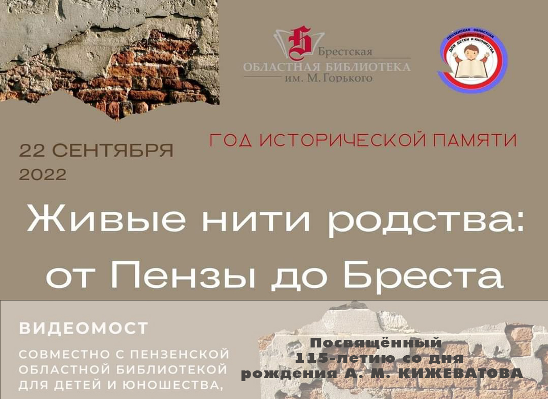22 сентября 2022 г. сотрудники юношеского отдела Брестской областной библиотеки им. М. Горького совместно с коллегами Пензенской областной библиотеки для детей и юношества провели виртуальный диалог «Живые нити родства: от Пензы до Бреста». Он был посвящён 115-летию со дня рождения защитника Брестской крепости, Героя Советского Союза А. М. Кижеватова, уроженца Пензенской области. В диалоге участвовали ученики 6-х классов средних школ № 7 г. Бреста и № 32 г. Пензы.