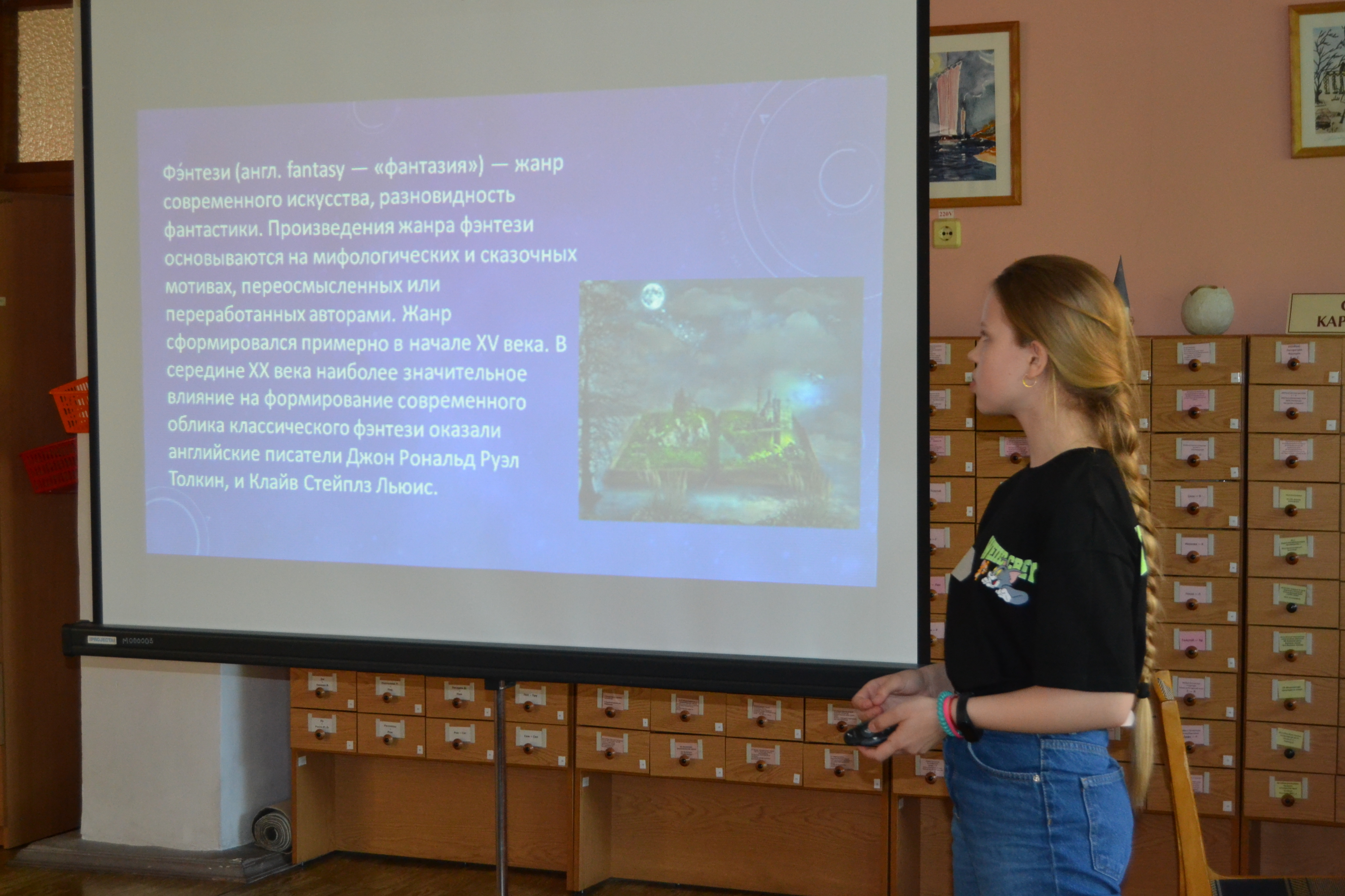 Александра, участница встречи, подготовила презентацию о фэнтези и рассказала о самых интересных книгах, написанных в этом жанре.