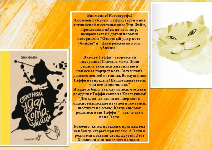 Февральские занятия в Школе маленьких волшебников начались с веселья и озорства. Как же нам хотелось быть такими же подвижными и активными, как кот Таффи из книги Энн Файн «Ответный удар кота-убийцы». Поэтому мы, взяв в руки кисточки с красками, начали воплощать в жизнь маленькие зарисовки из книги: кто-то рисовал доброго Таффи, кто-то злого, кто-то реализовал кошачьи посиделки на заборе, а кто-то представил, как бы выглядела картина, нарисованная самим Таффи. |