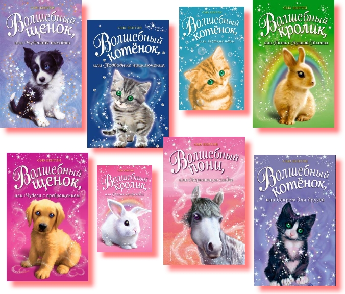Книги Сью Бентли «Приключения волшебных зверят» подойдут для обучения детей самостоятельному чтению. На страницах немного текса, шрифт крупный. Истории будут интересны детям 6–10 лет. Главные действующие лица — ребята, которые попадают в необычные ситуации, встречаются с волшебными животными. В книгах раскрываются понятные и близкие детям ситуации, поднимаются вопросы дружбы, первой любви, отношений с родителями.