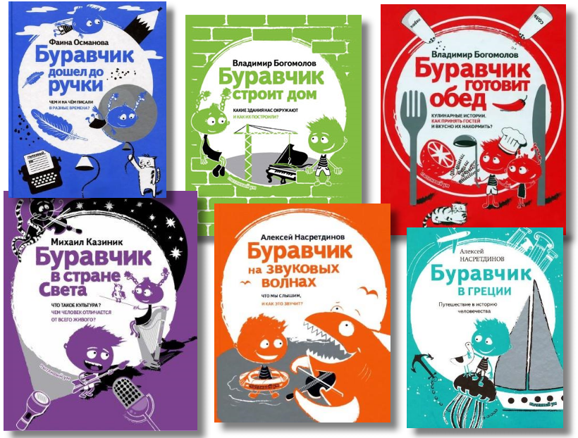 Серия книг про Буравчика издательство «Бослен» началась в 2014 г. Каждая книга - это дидактическая сказка, в которой главный герой – мальчик Буравчик – знакомит читателя с разными темами: Древняя Греция, архитектура, культура и искусство, физика музыки. Книги серии пишутся разными авторами.